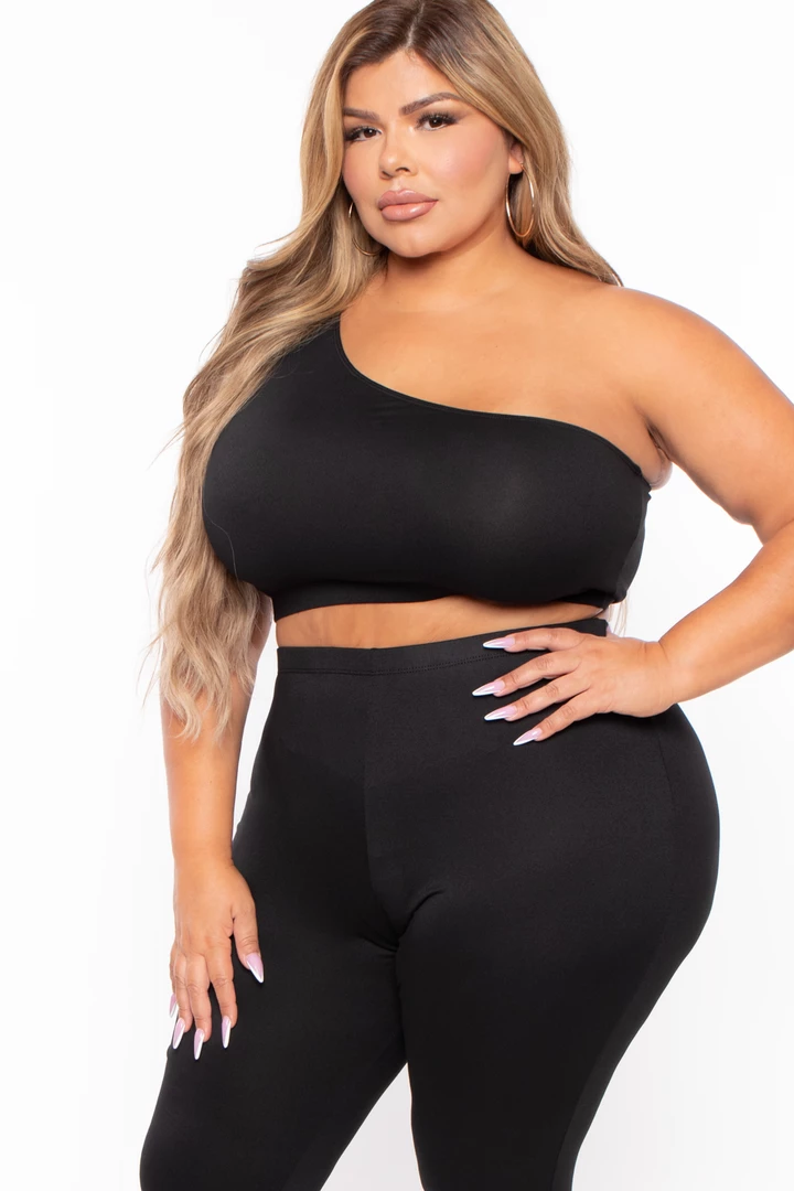 This plus size, stretch butter soft knit top and leggings set. The top features an asymmetric neckline, sleeveless, ankle length leggings has an elastic waist, sleek fit. Versatile from yoga to a night out.