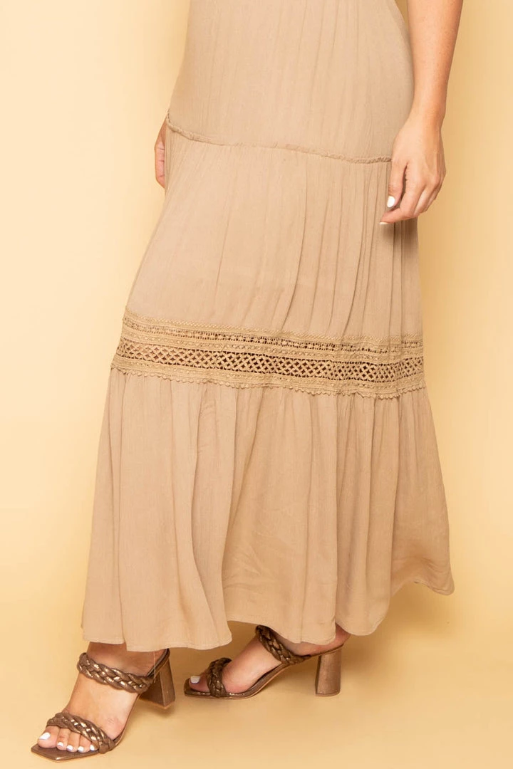 This plus size stretch dress features a smocked tube top neckline, layered maxi length with crochet lace detail, inner mini skirt lining, and a flowy floor length.