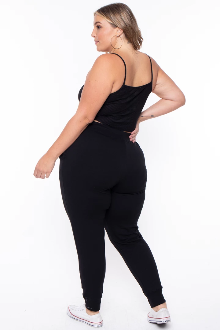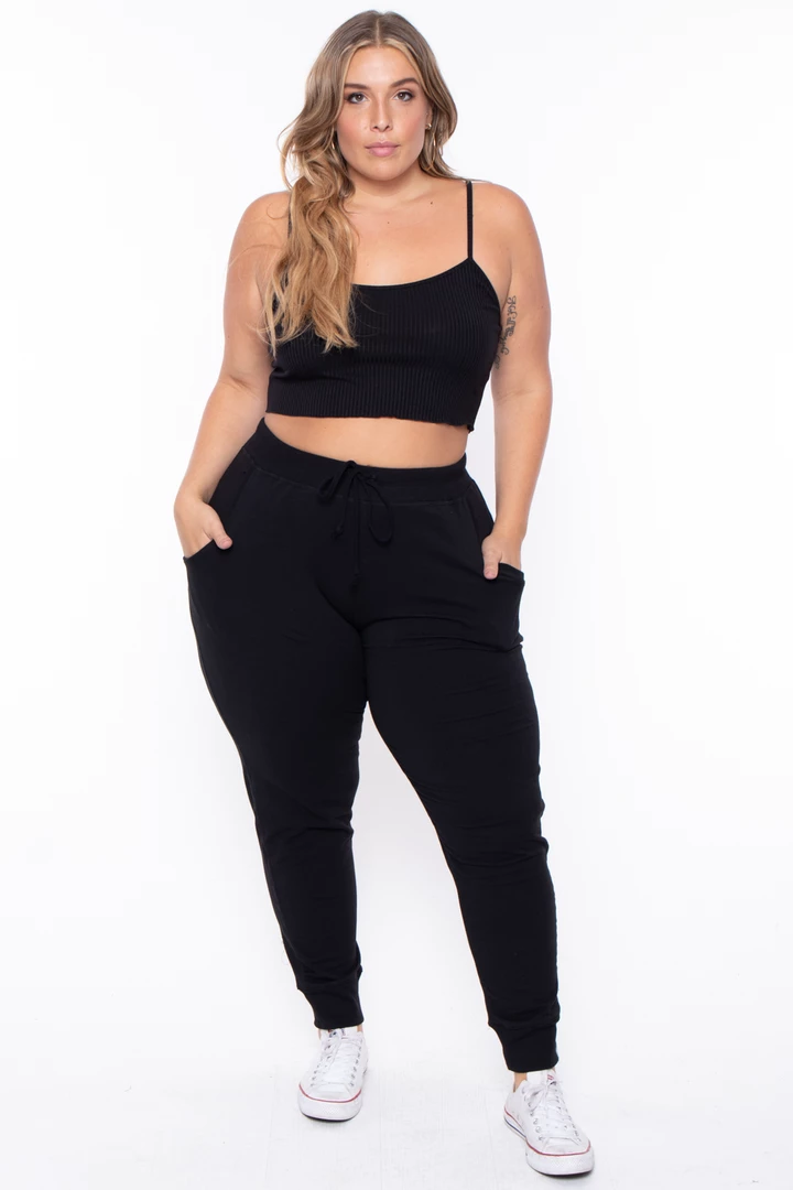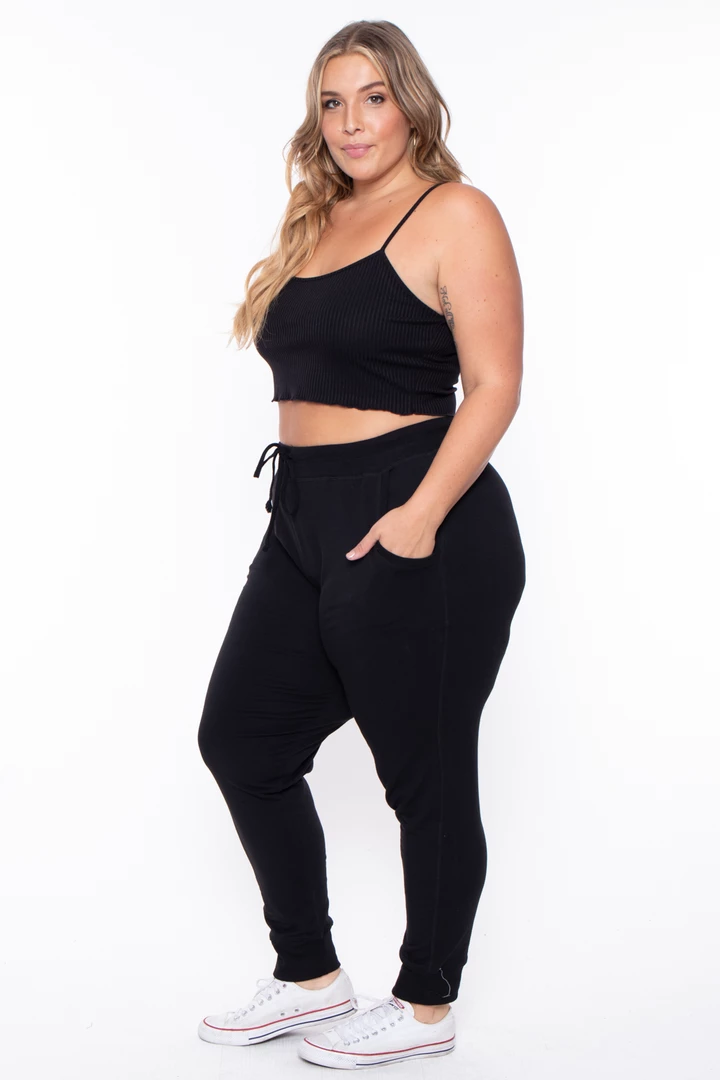 This plus size, pair of sweat joggers feature an elasticized waist and drawstrings for adjustment side pockets construction and banded bottom hem