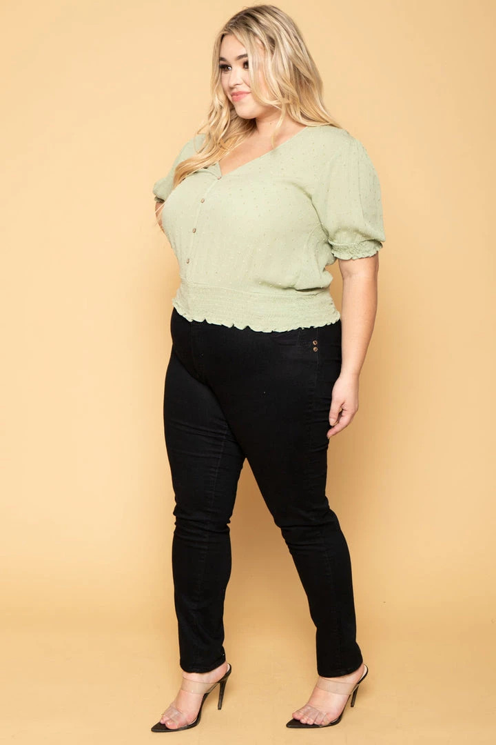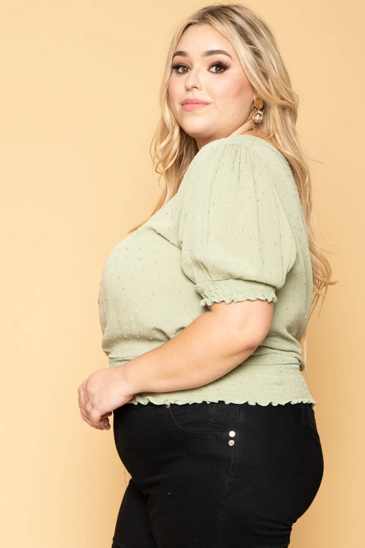 This plus size, woven shirt features a dotted chiffon material that is lightweight and sheer, smocked waist and sleeve hems, faux button accents and v neckline