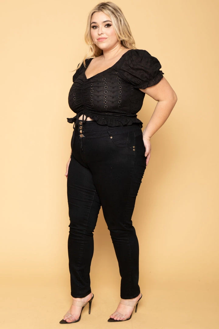 This plus size, top features a lightweight eyelet material, with puff sleeves, front ruching and ruffled hem detail