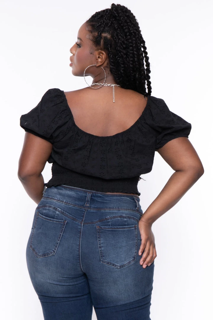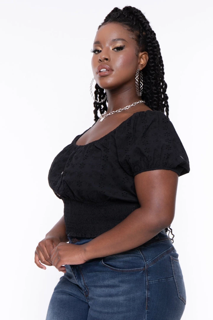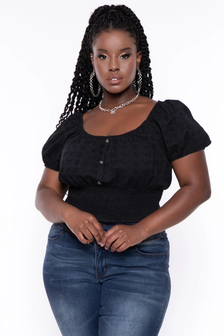 This plus size, woven blouse features a delicate eyelet material, smocking at the waist, faux button details and puffed sleeves