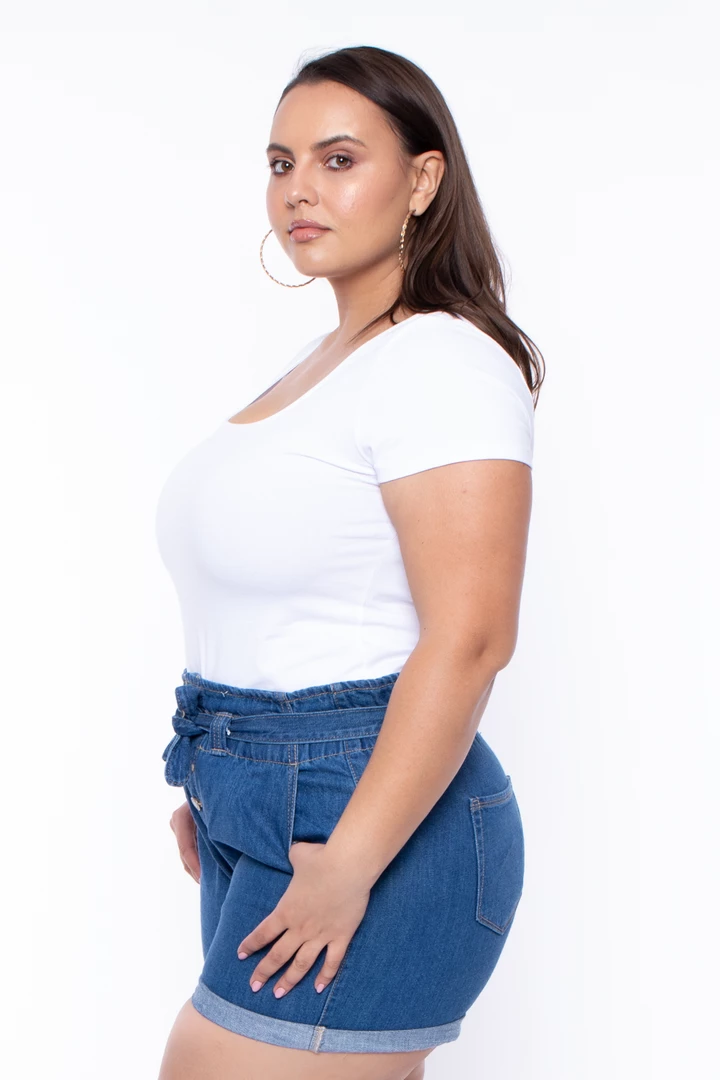 This plus size, stretch knit top features a scoop neckline, short sleeves & straight hem.