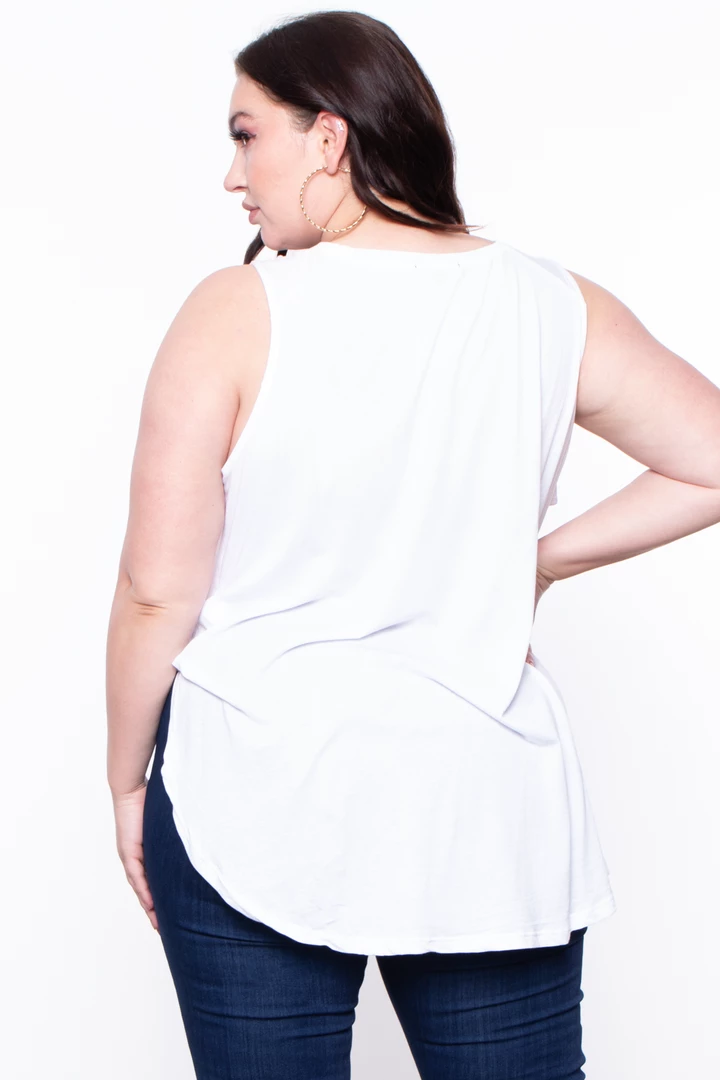 This plus size knit top features a high scoop neck, sleeveless style with tulip tunic hemline.
