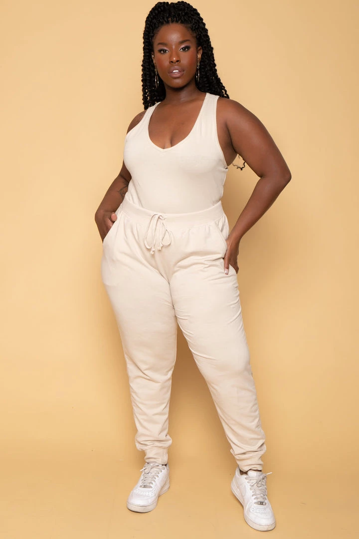 This plus size, pair of sweat joggers feature an elasticized waist and drawstrings for adjustment, side pockets construction, and banded bottom hem