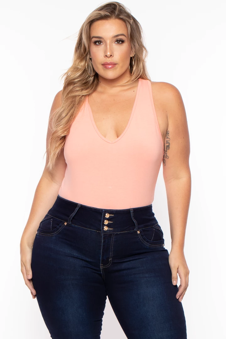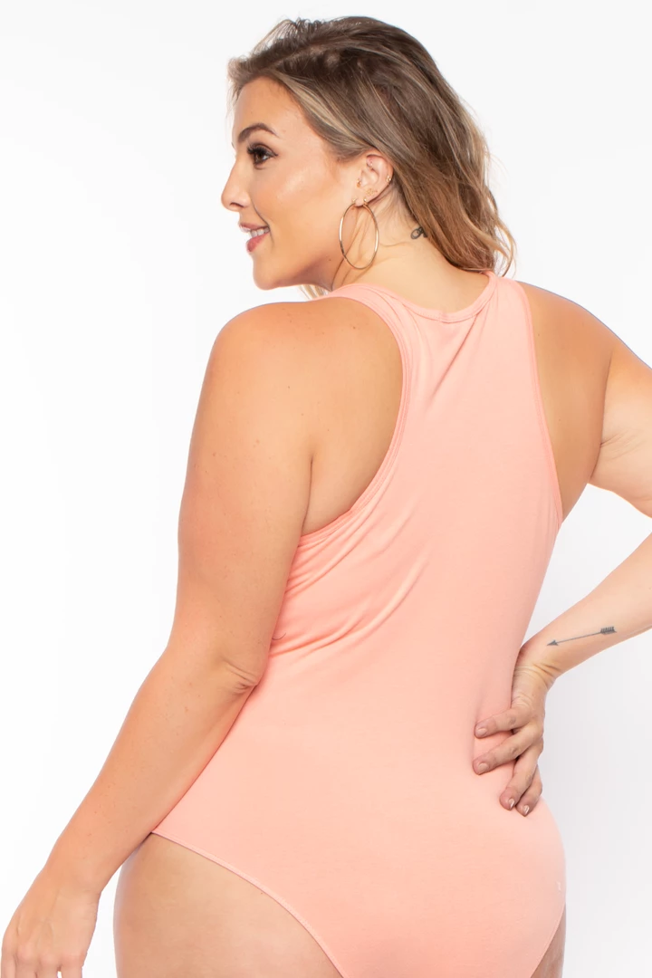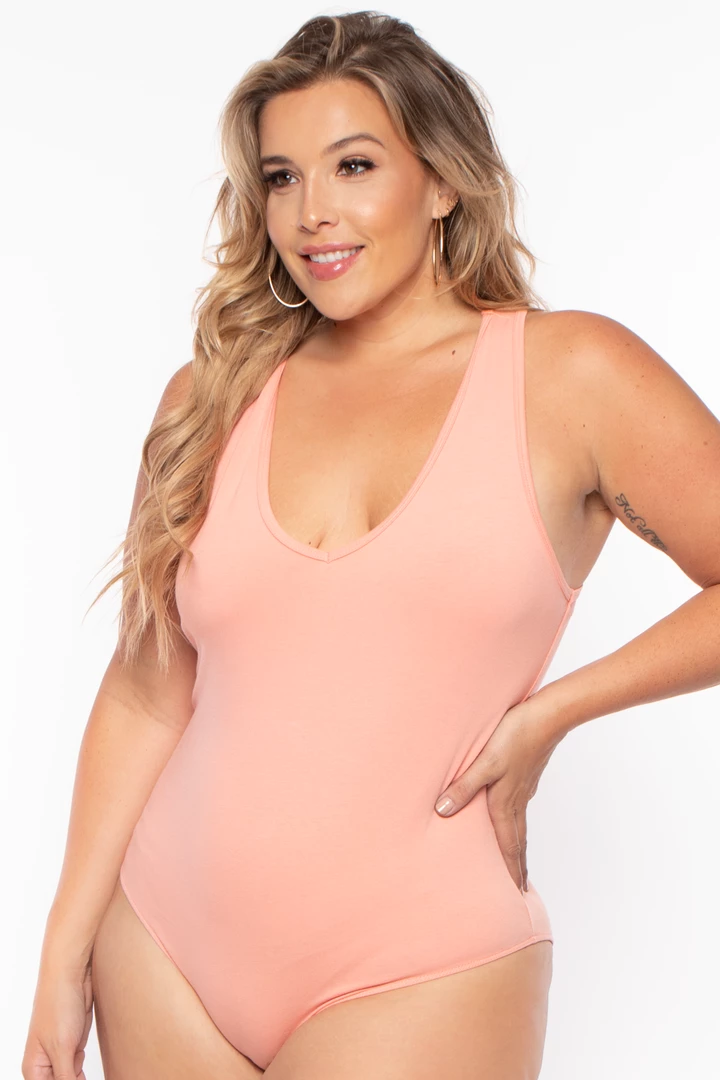This plus size, stretch knit bodysuit features a v-neckline, snap bottom closure, and a sleeveless racer back cut.