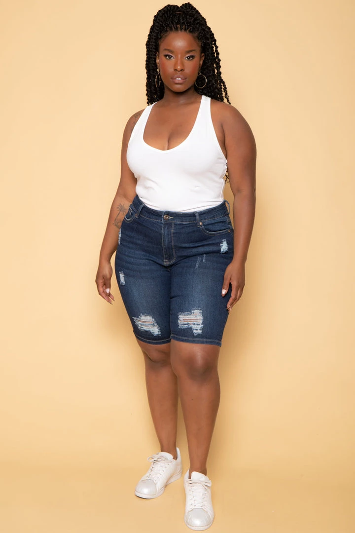 This plus size, stretch knit bodysuit features a v-neckline, snap bottom closure, and a sleeveless cut.