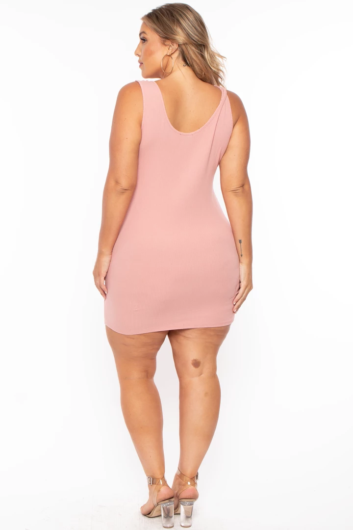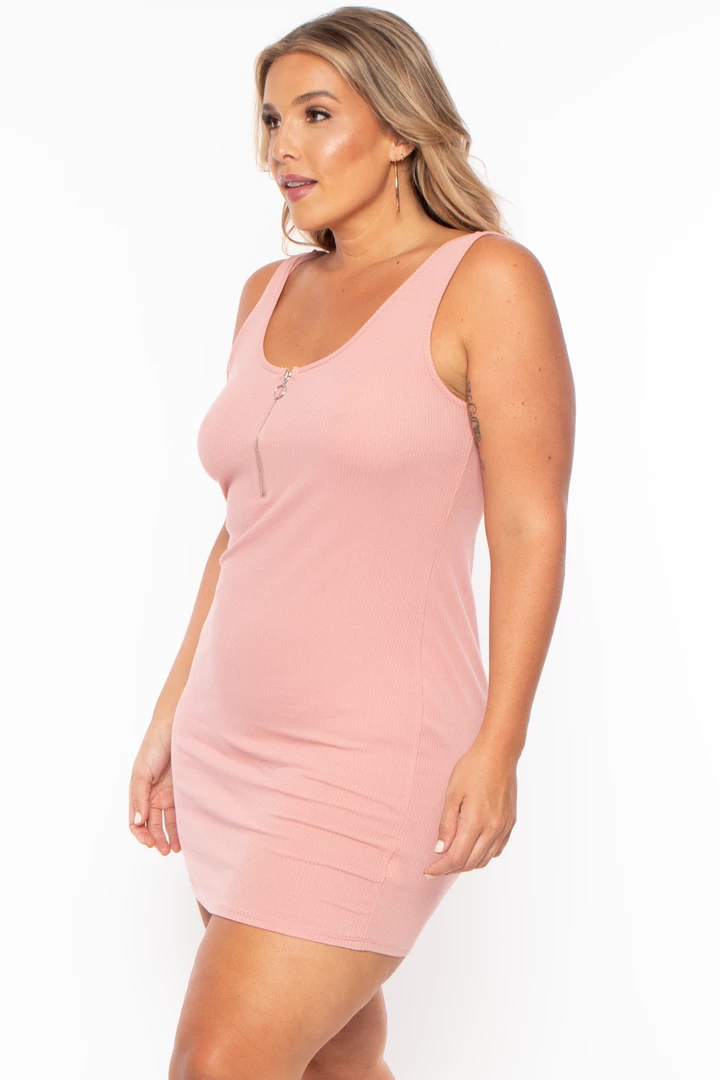 This plus size, stretch knit ribbed dress features a scoop neckline, front zipper closure a sleeveless cut, and a bodycon silhouette.