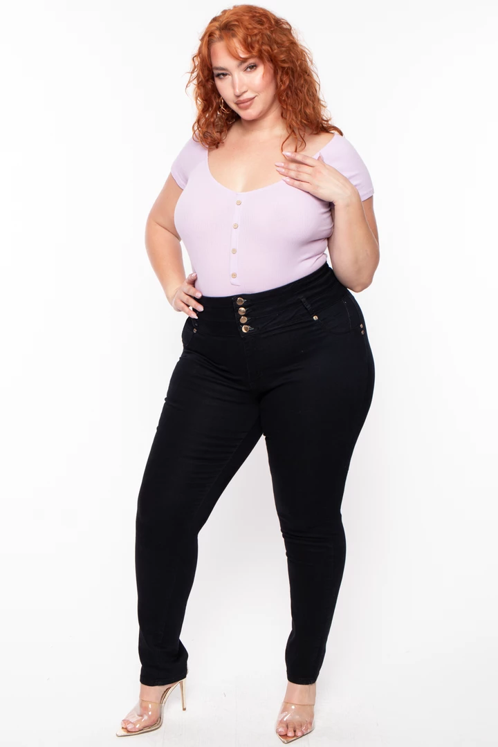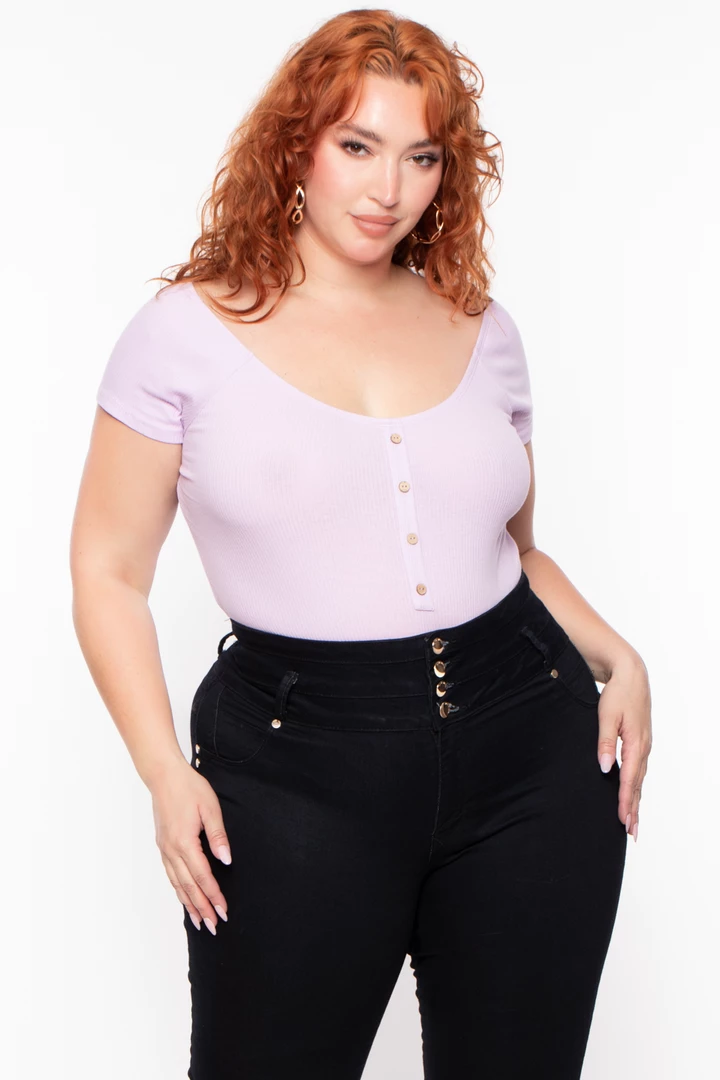 This plus size stretch knit bodysuit features a scoop off the shoulder neckline, short sleeves, faux 4 button detail. and with dual snap-button closure. A very sexy and cute bodysuit can be styled with formal bottoms or some cute denim pants.