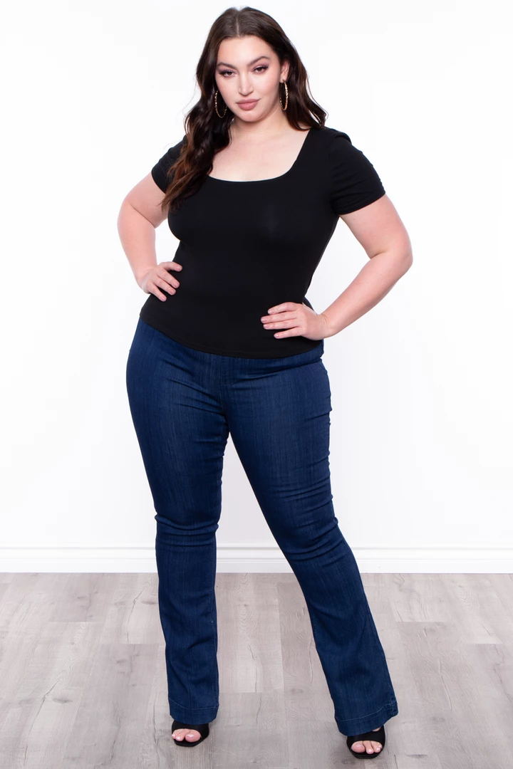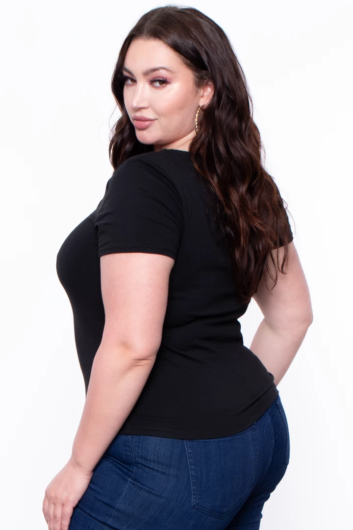 This plus size, stretch knit top features a scoop neckline, short sleeves & straight hem.