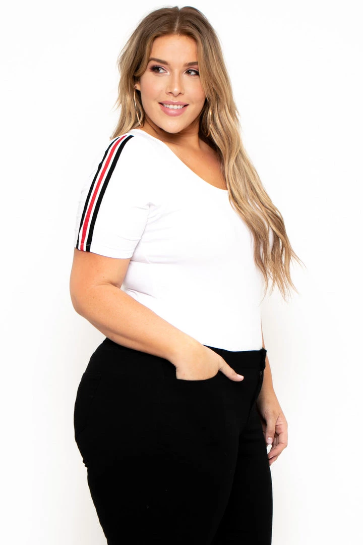 This plus size, stretch knit bodysuit a scoop neck, short sleeves with multi-color stripe trim, cheeky cut bottom, and dual snap-button bottom closures.
