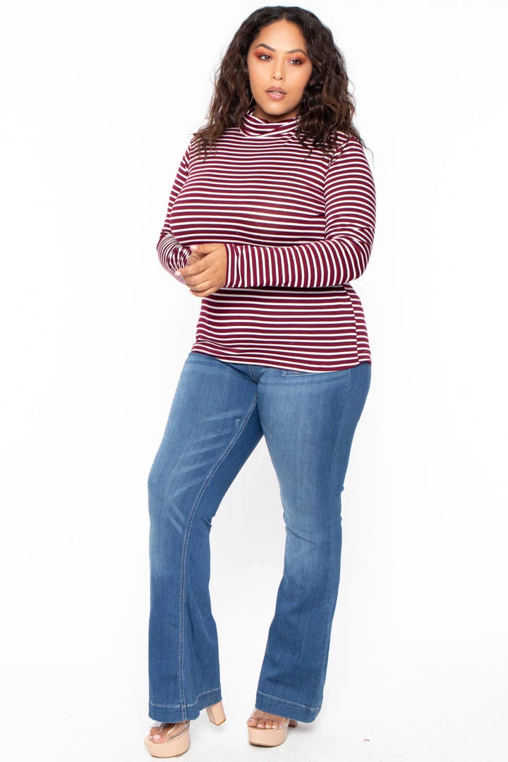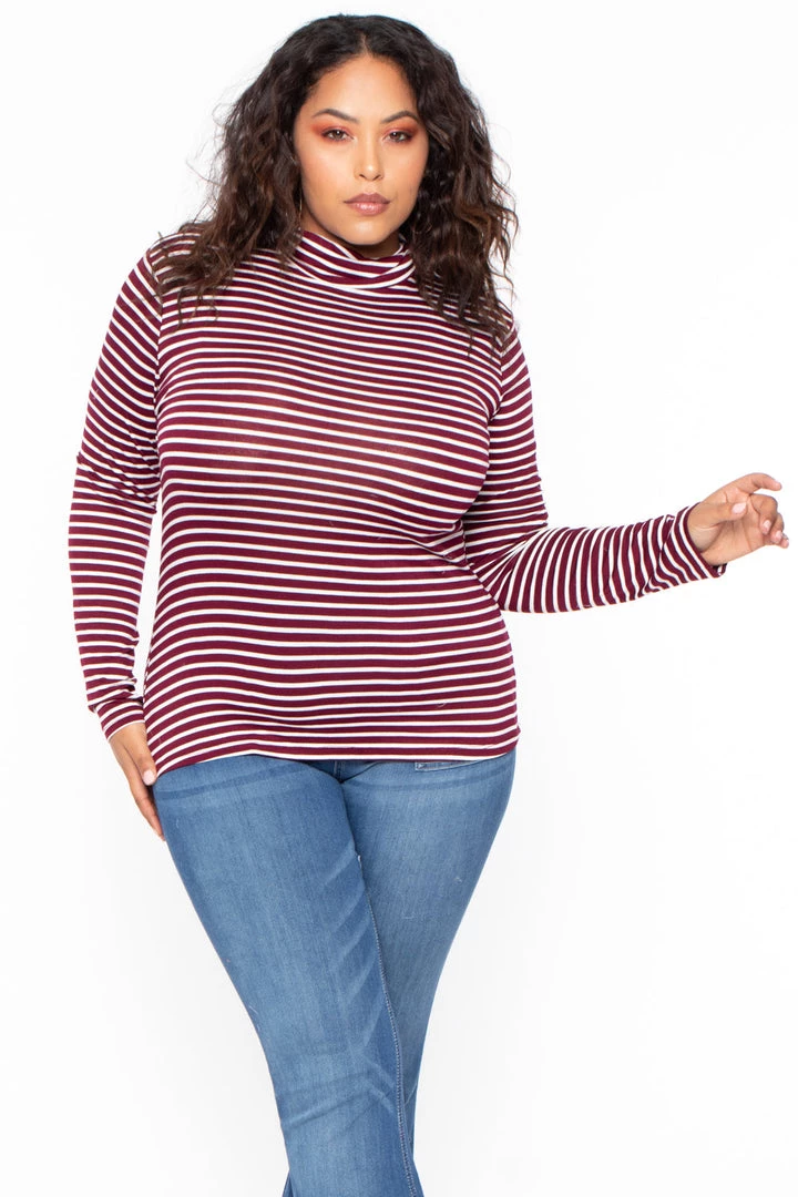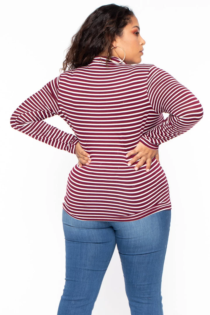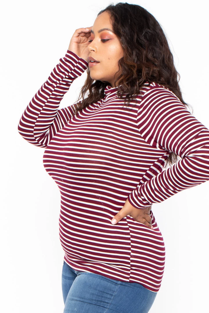 This plus size, stretch knit top features an all around striped print, a turtleneck, long sleeves, and a form-fitting silhouette.