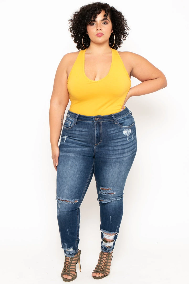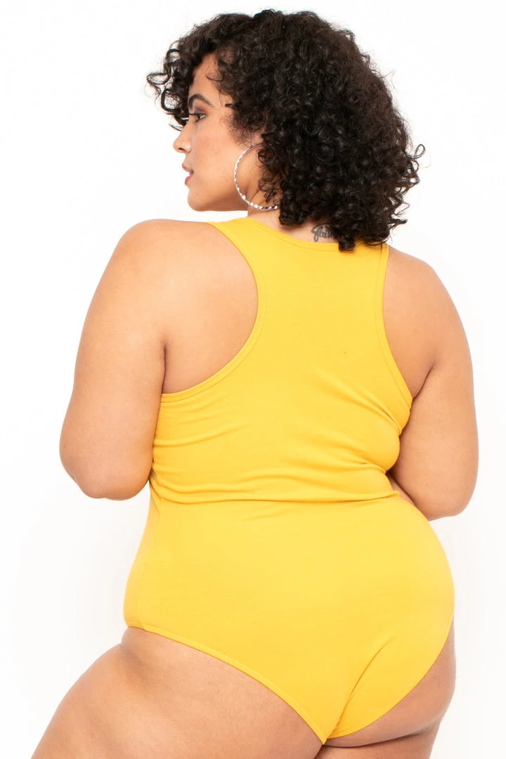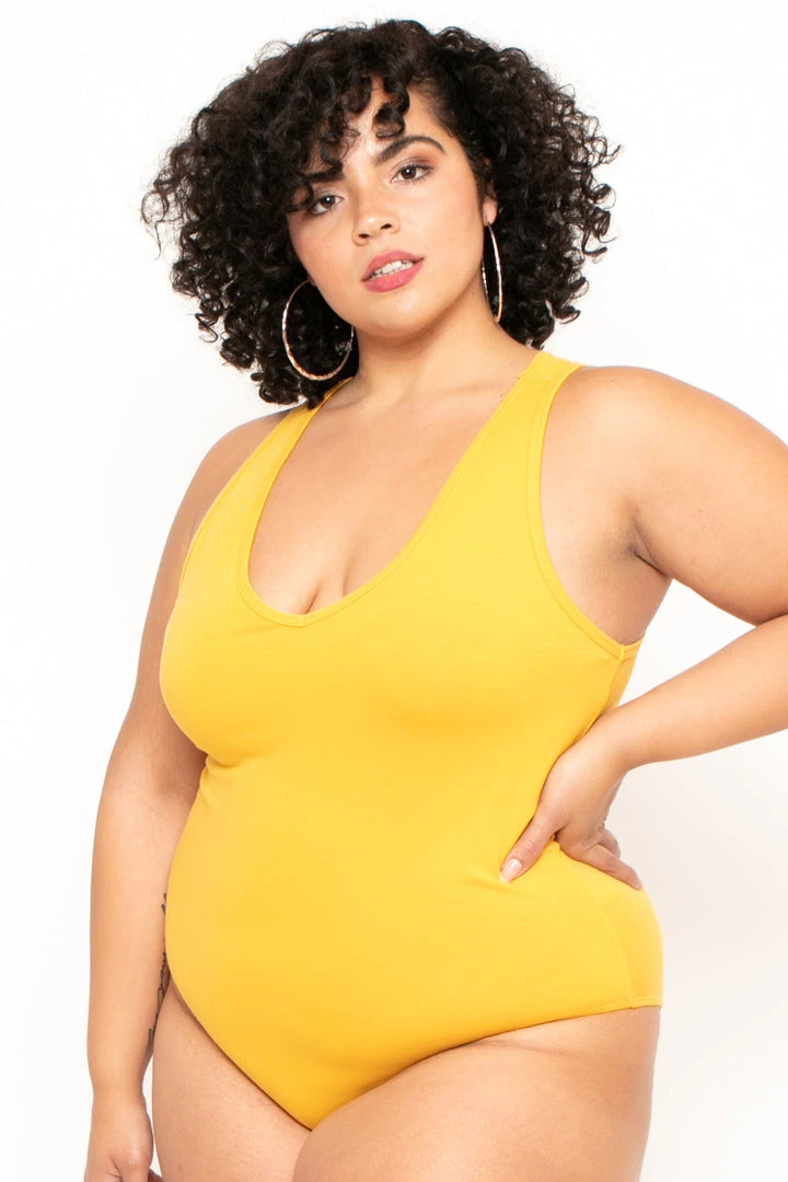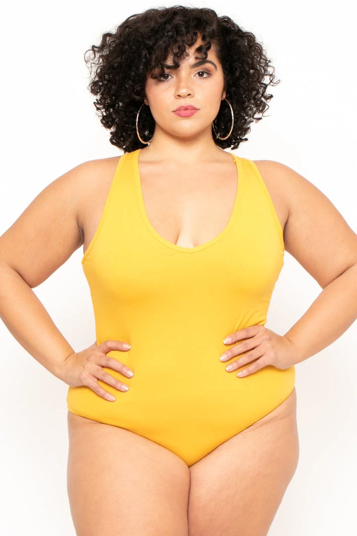 This plus size, stretch knit bodysuit features a v-neckline, snap bottom closure, and a sleeveless cut.