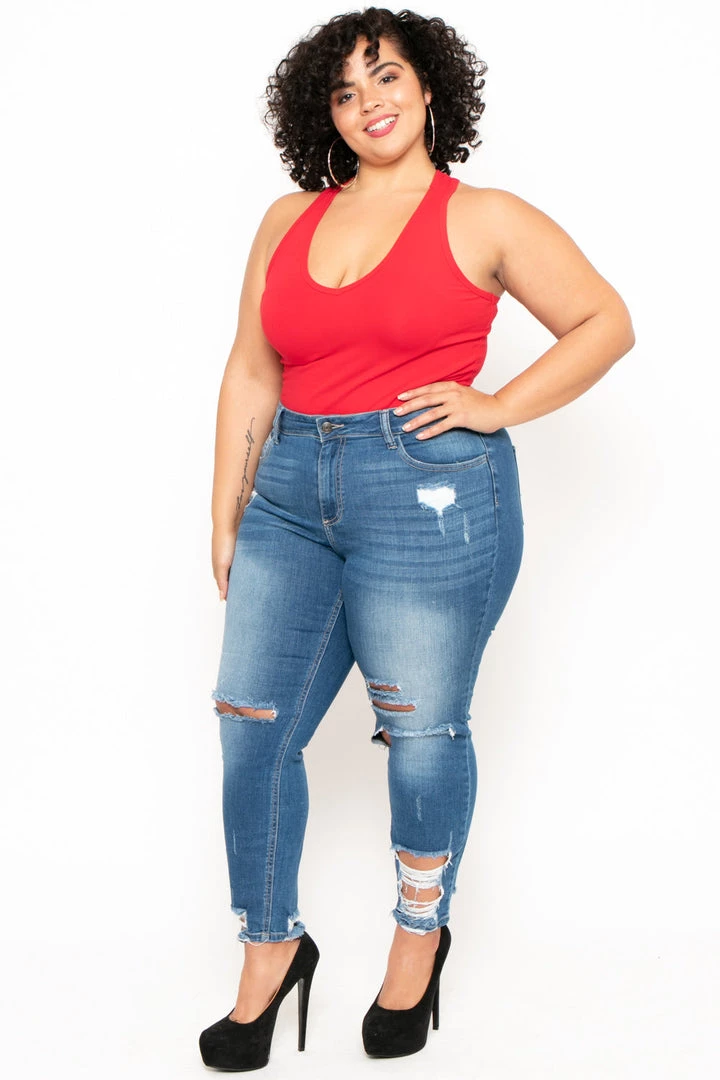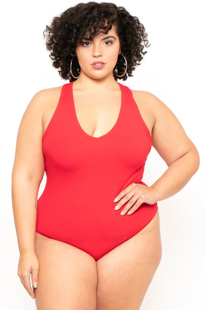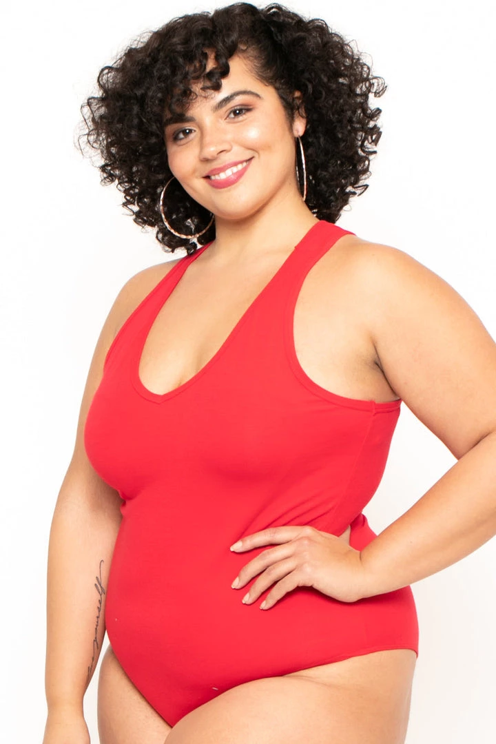 This plus size, stretch knit bodysuit features a v-neckline, snap bottom closure, and a sleeveless cut.