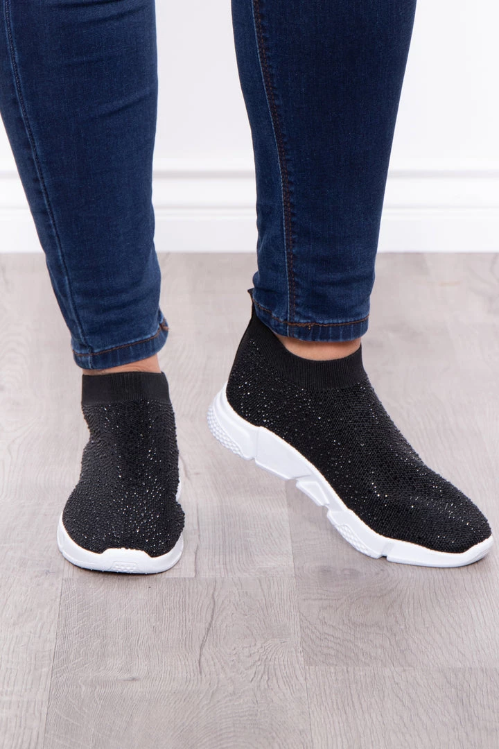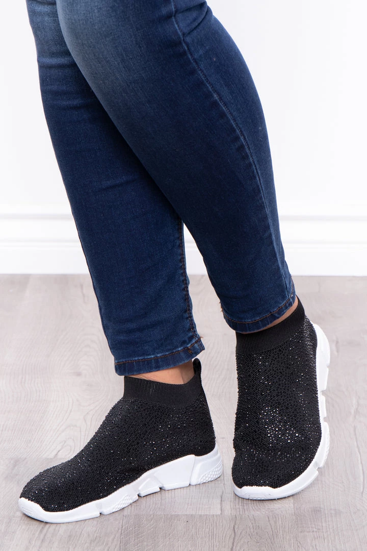 A pair of ankle rise sneakers, by Azalea Wang, featuring an all over knit fabric, contrast sole, a slip-on construction, and matching rhinestones covering the entire body.