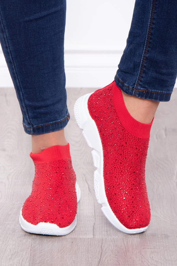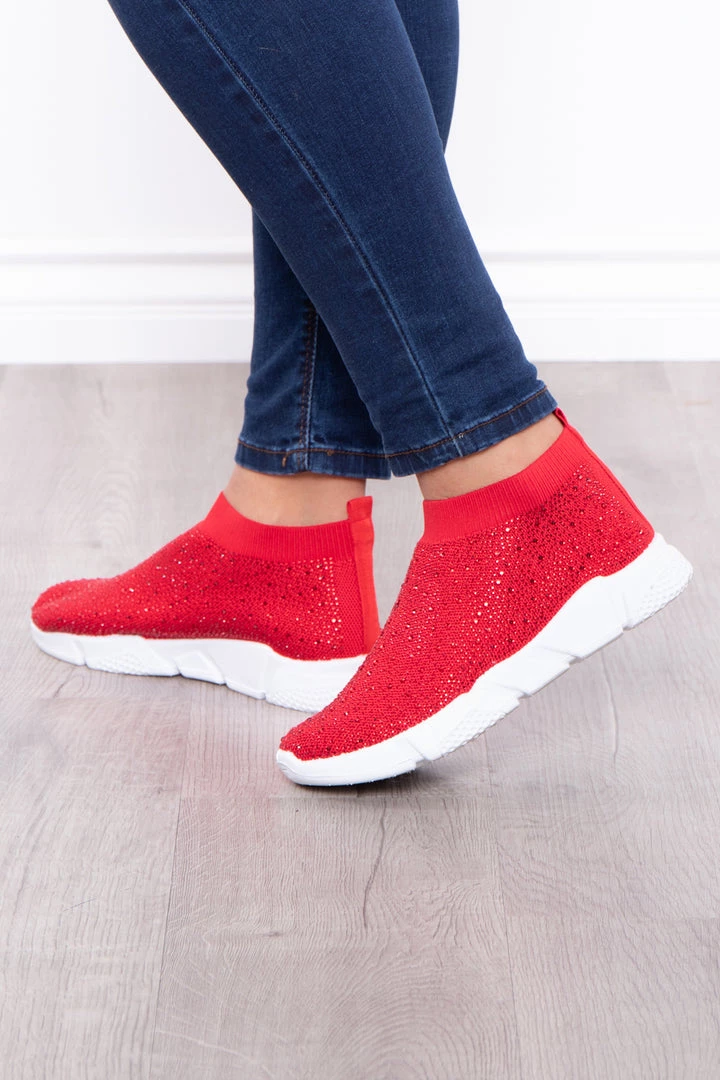 A pair of ankle rise sneakers, by Azalea Wang, featuring an all over knit fabric, contrast sole, a slip-on construction, and matching rhinestones covering the entire body.