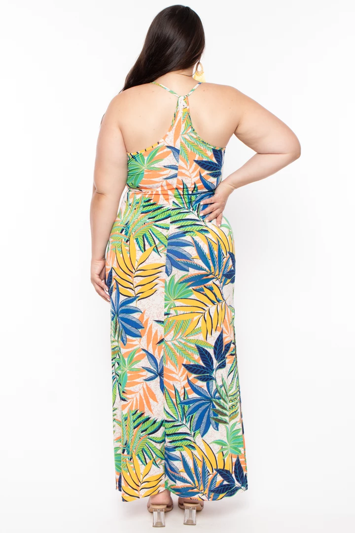 This plus size, maxi dress features V-neckline with a spaghetti strap that goes around to the back a racerback cut detail all-over tropical print, and maxi length with side hem slits