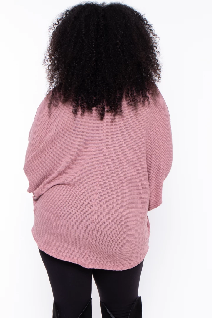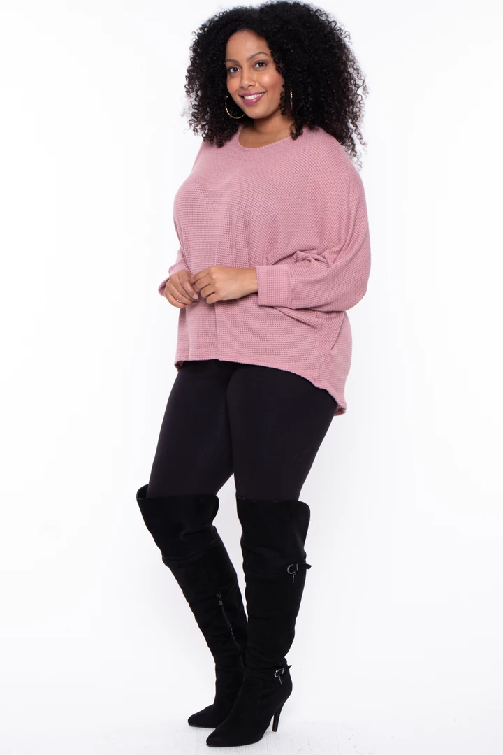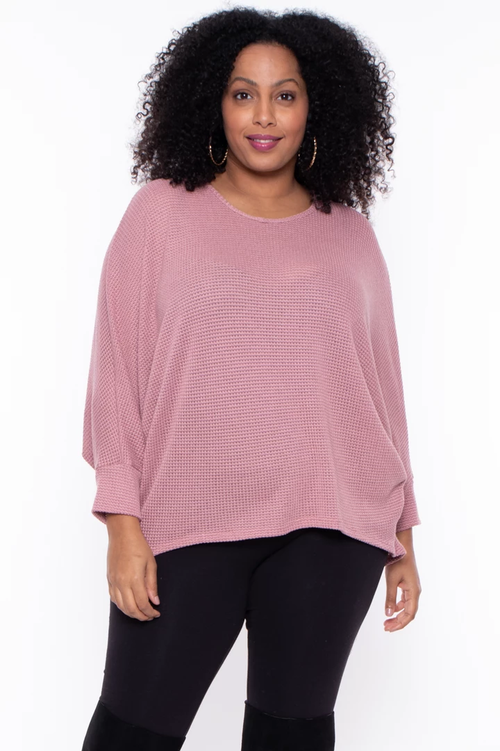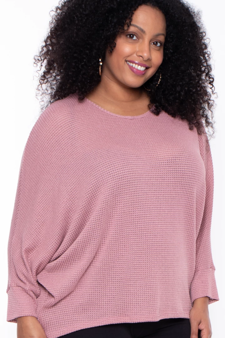 This plus size, textured knit top features a hi-low hem, draped sleeves and a round neckline for an easy cozy fit.