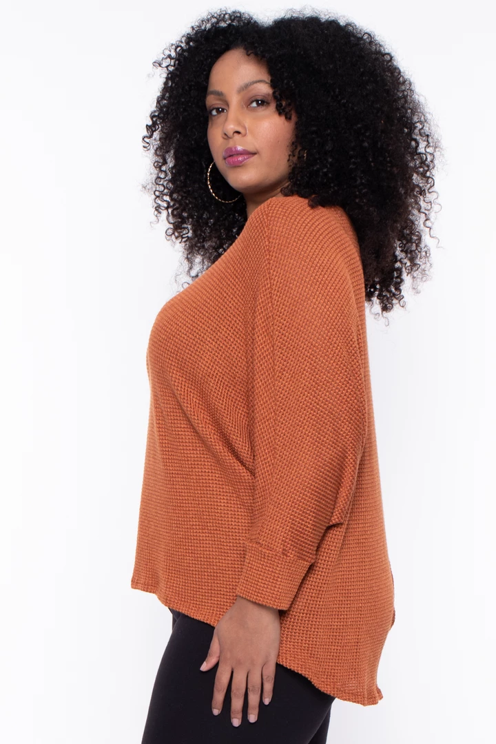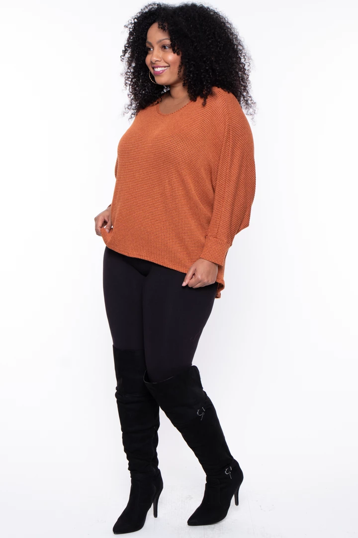 This plus size, textured knit top features a hi-low hem, draped sleeves and a round neckline for an easy cozy fit.