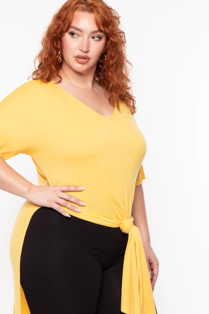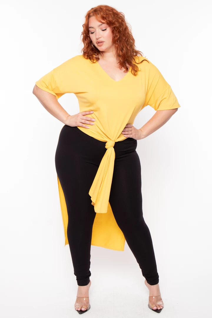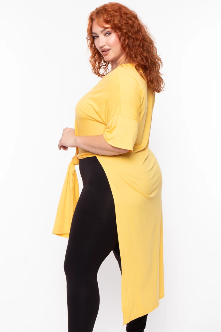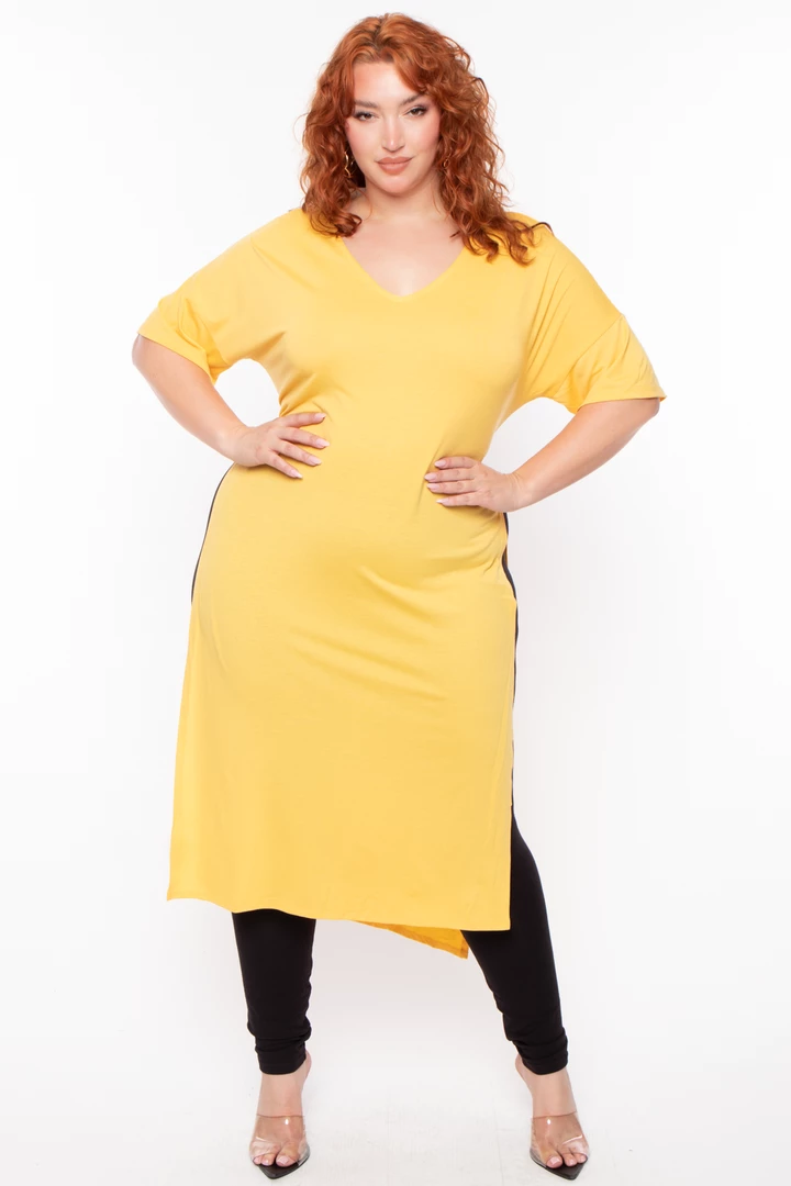 This plus size casual and fun shirt features a v-neckline, dropped shoulders, 3/4 length sleeves, side slits, and maxi length relaxed fit. Create a front knot for an edgy and cute look.