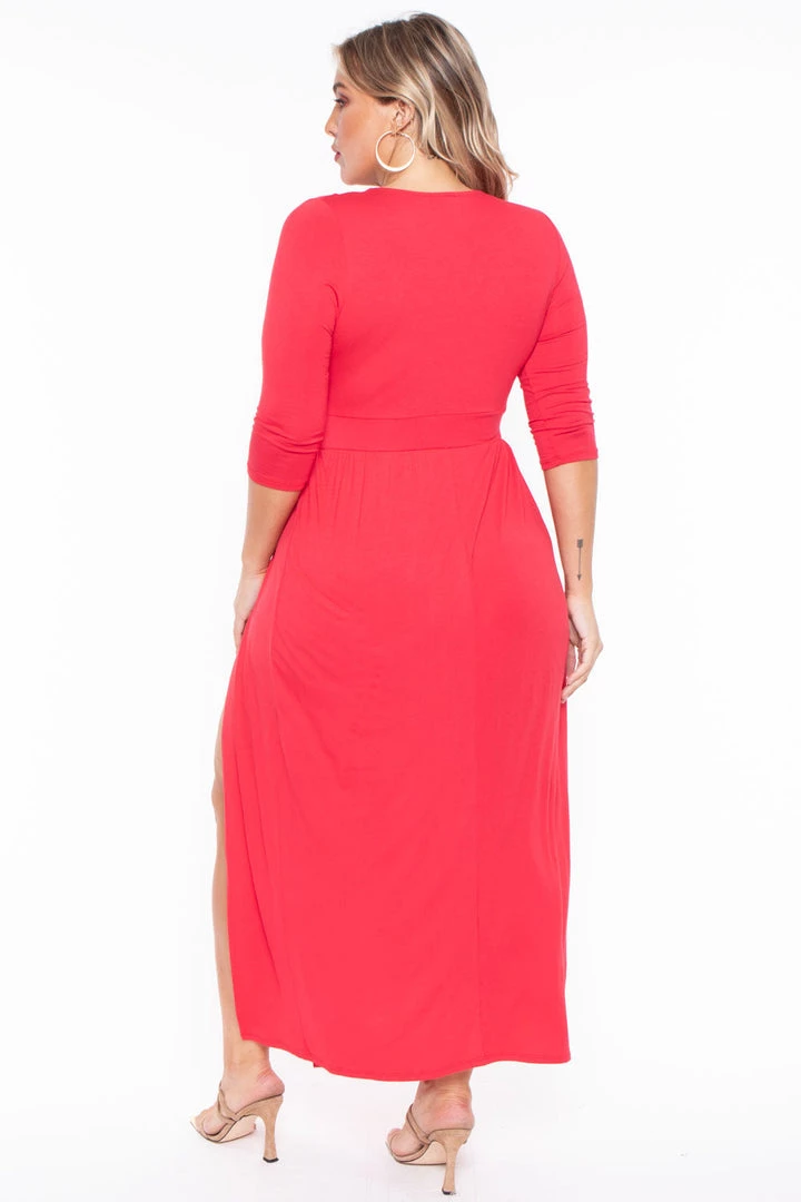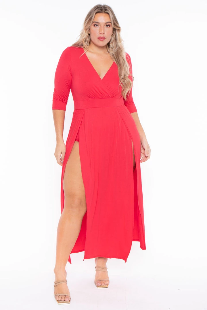 This plus size, stretch knit maxi dress features a plunging surplice neckline, long sleeves, attached bodysuit with a dual snap-button bottom closure, and a dramatic front M-slit