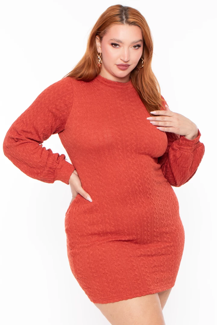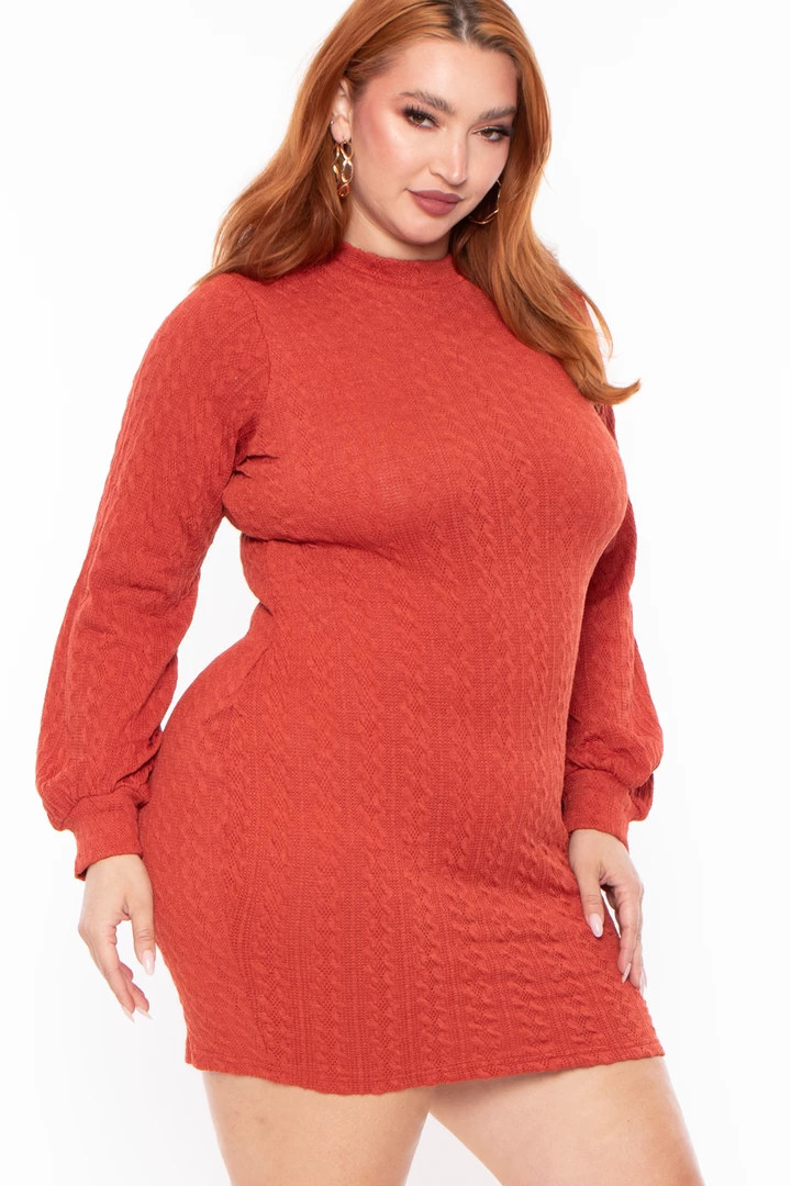 This plus-size stretch knit sweater dress features a mock neckline, long tapered sleeves, and a mini length bodycon sillouhete. This soft and yummy dress is the perfect transition for fall.