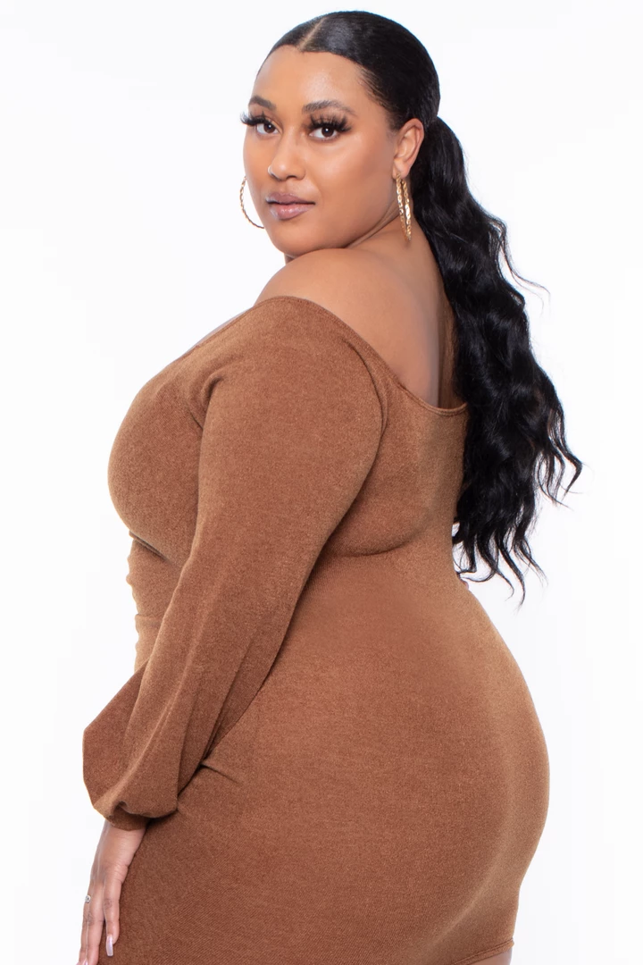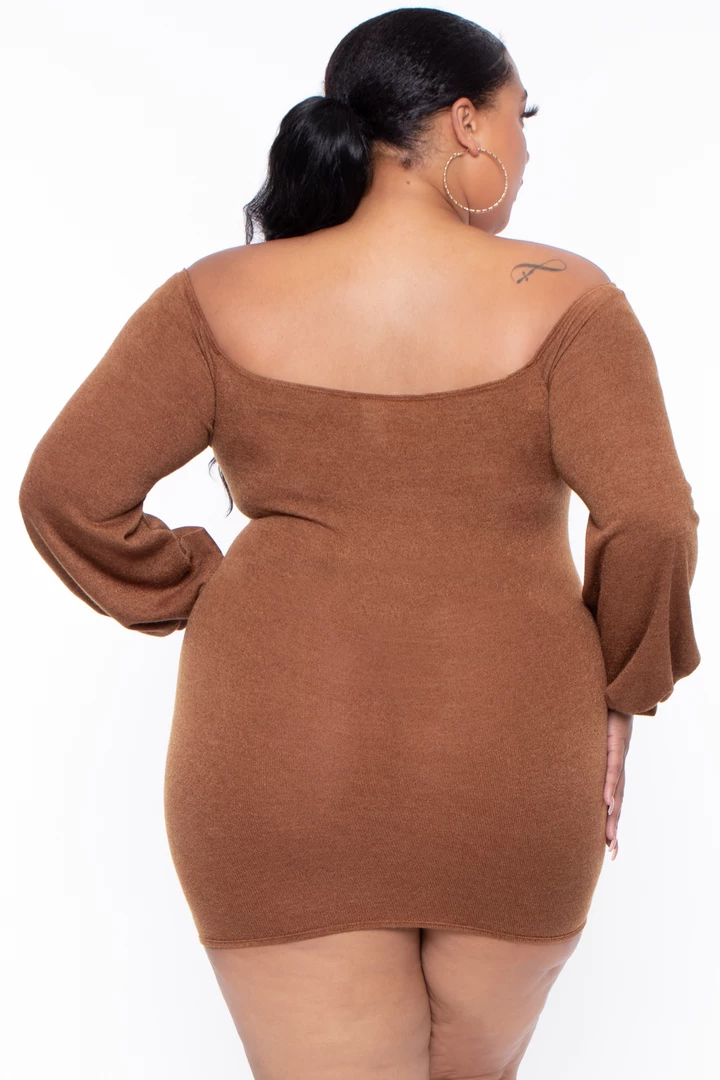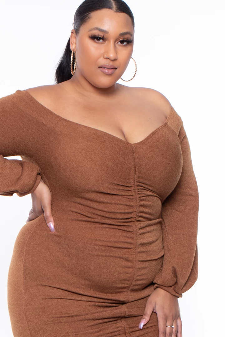 This plus size, knit strech features a V-neckline, long sleeves self banded hem and gathering detail front ruched detailing to the hem and a bodycon silhouette and mini length