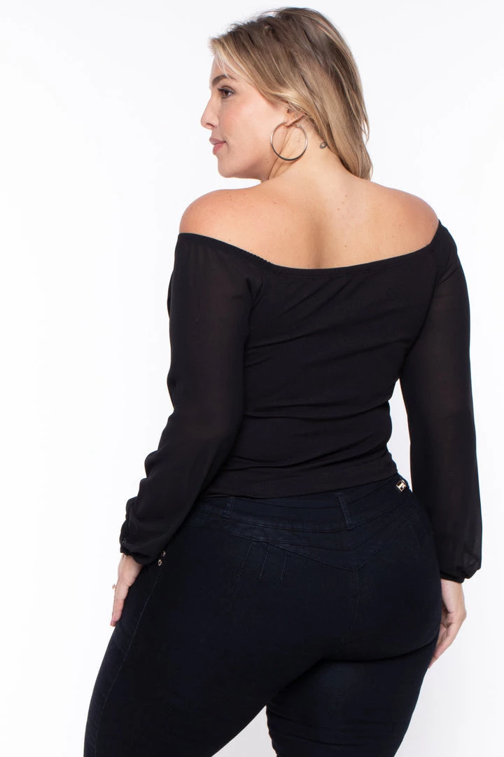 This plus size, off the shoulder top features a sexy v neck complimented by a cross over of draped fabric