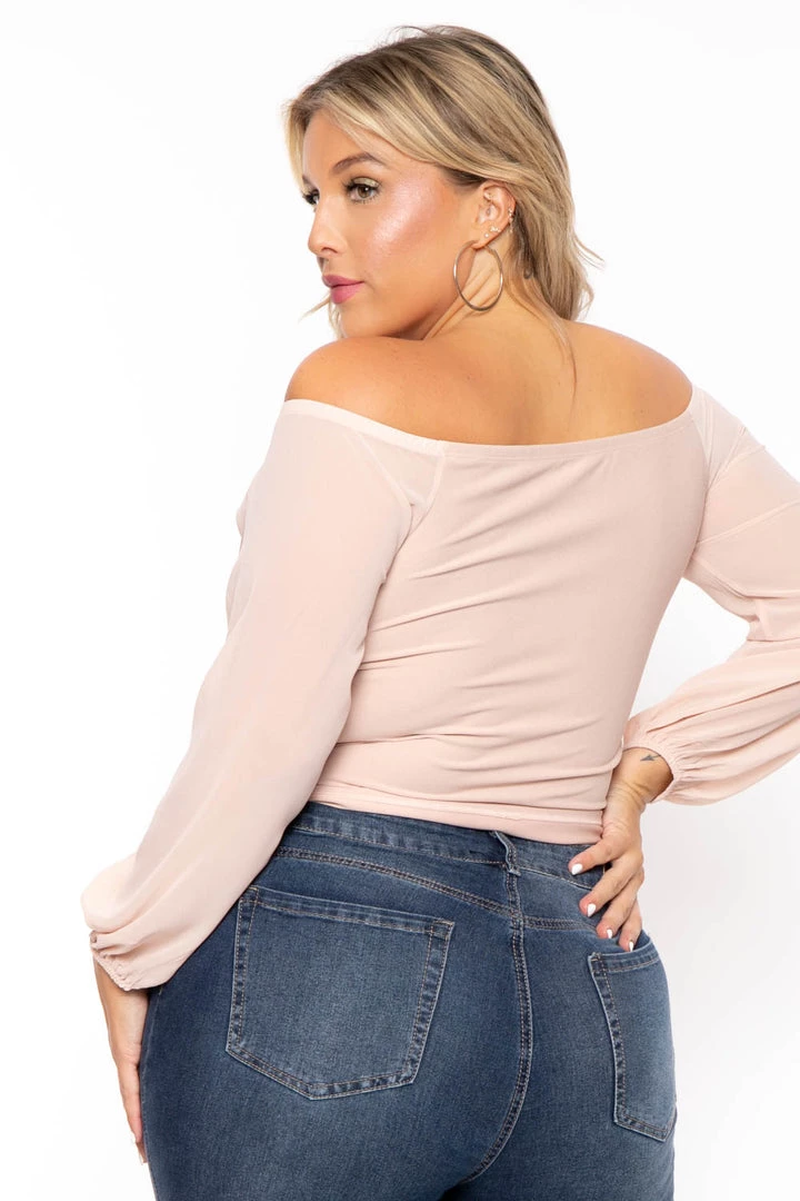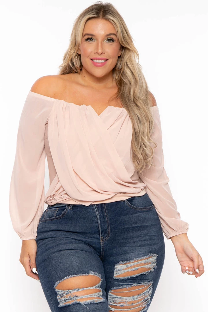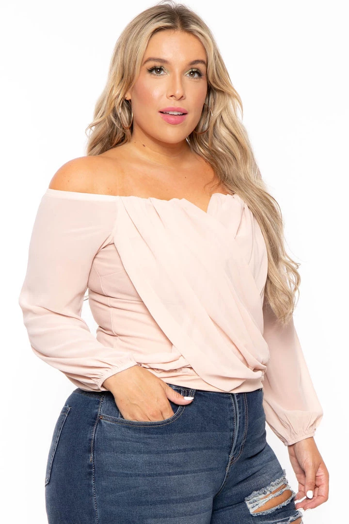 This plus size, off the shoulder top features a sexy v neck complimented by a cross over of draped fabric