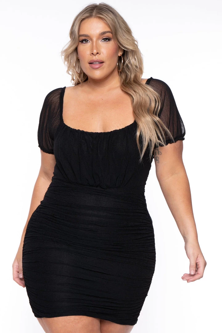 This plus size, mini dress features a mesh overlay body with ruched sides for a sexy curve hugging silhouette, and small puffed sleeves