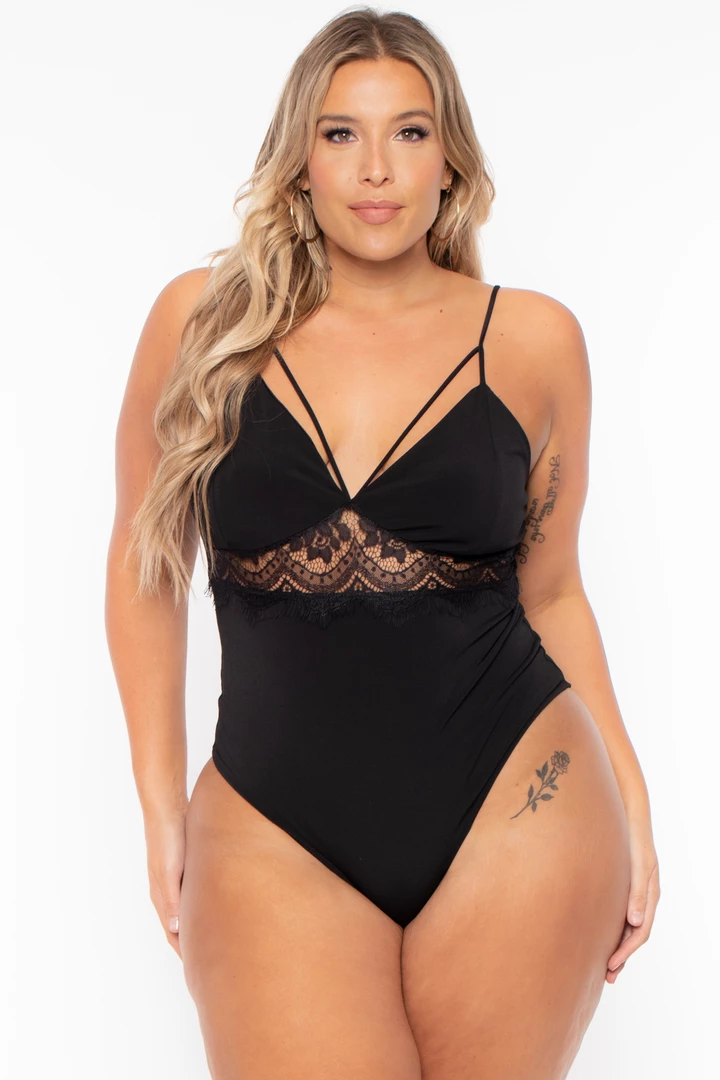 This plus size, extra stretch knit bodysuit features a plunging V-neckline with a strappy detail, a lace inset below the neckline, a sleeveless cut, and a snap-button closure.