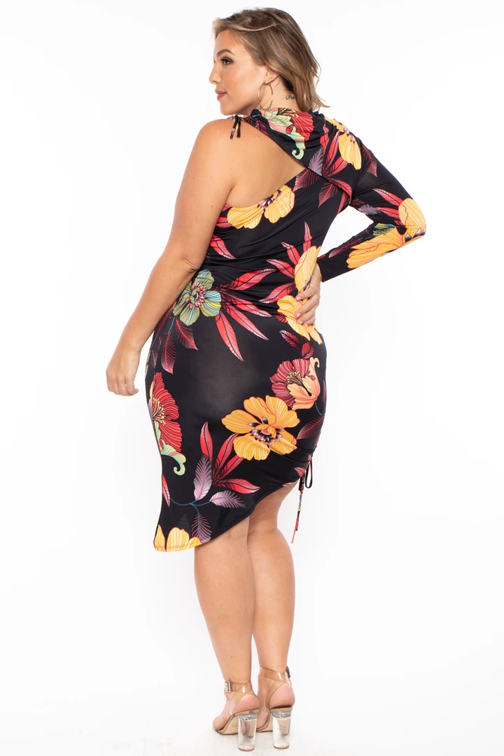 This plus size, stretch-knit dress features an asymmetric neckline, one long sleeve, side ruched detailing to the hem with adjustable straps, and a bodycon silhouette with all-over floral print