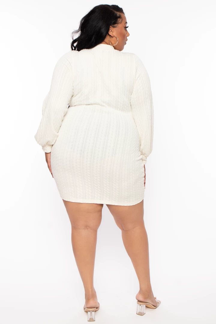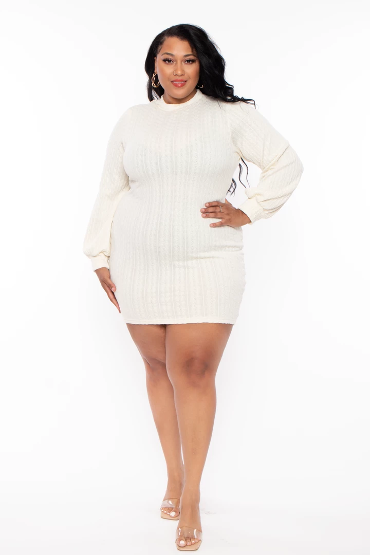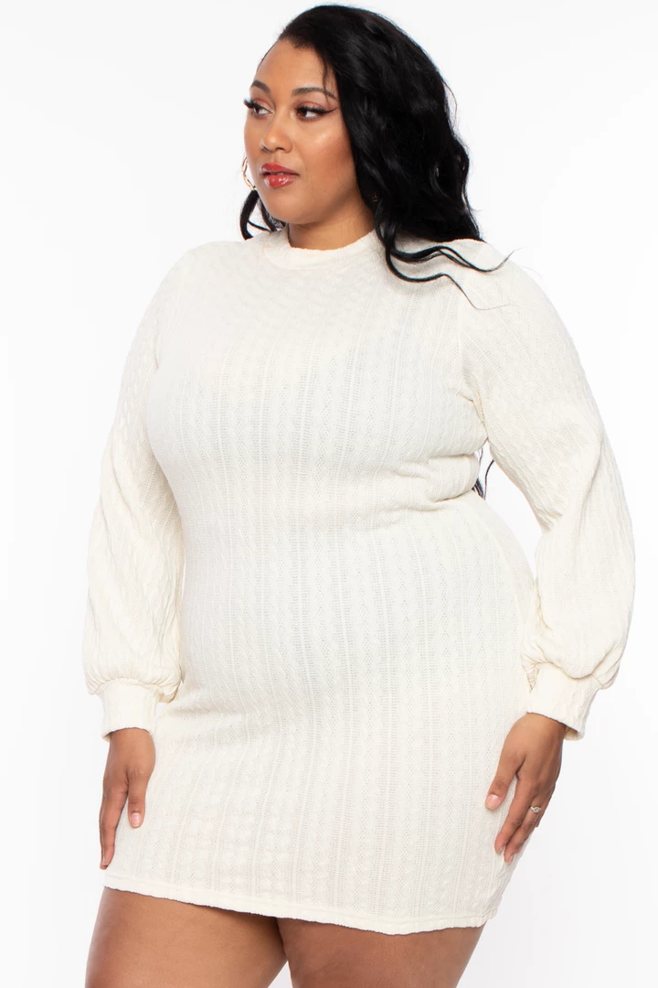 This plus-size stretch knit sweater dress features a mock neckline, long tapered sleeves, and a mini length bodycon sillouhete. This soft and yummy dress is the perfect transition for fall.