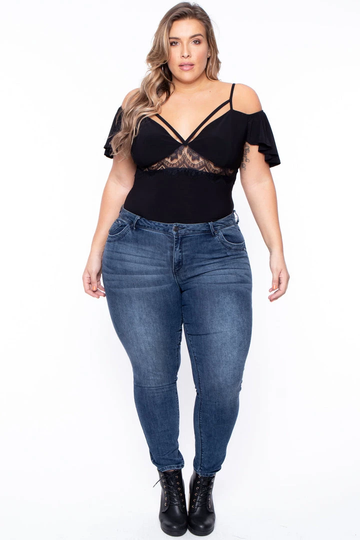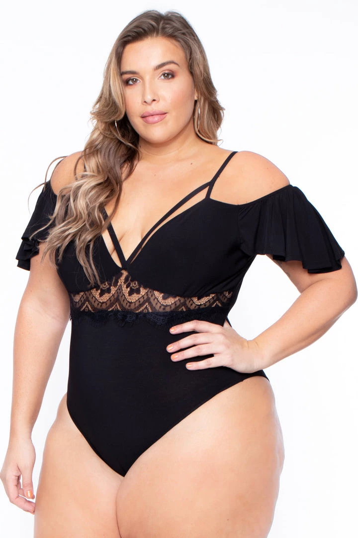 This plus size, extra stretch knit bodysuit features a plunging V-neckline with a strappy detail, a lace inset below the neckline, a short sleeve cut, and a snap-button closure.