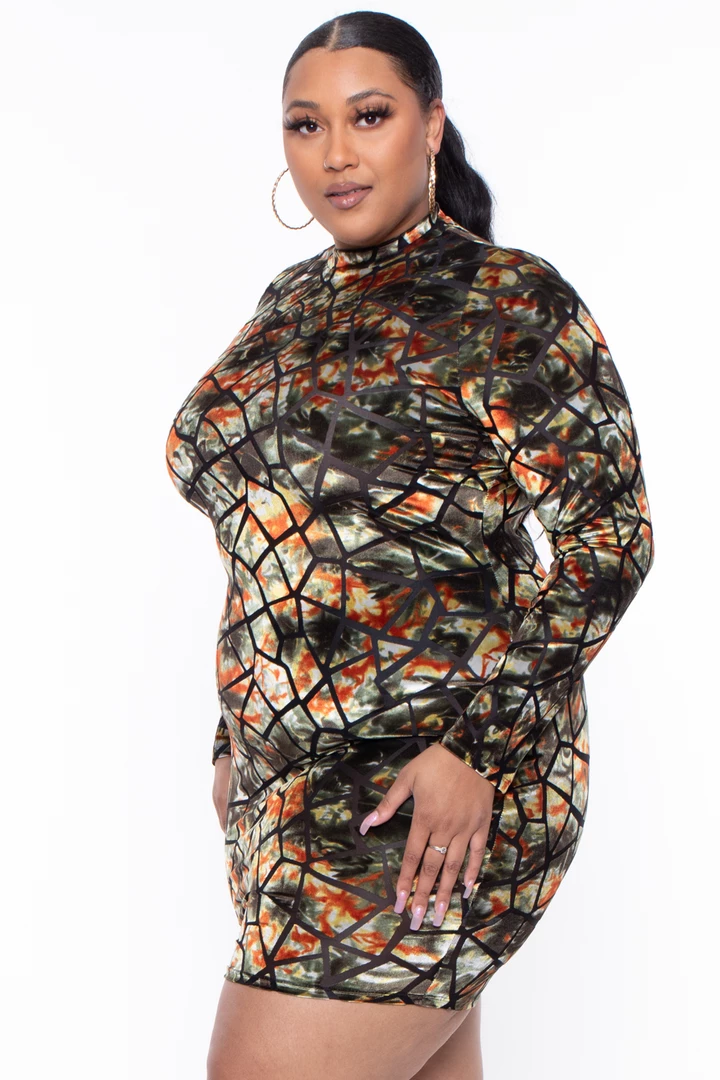 This plus size, stretch knit dress features a mock neckline back keyhole with dual button closure long sleeves and a bodycon silhouette with a burnout detail