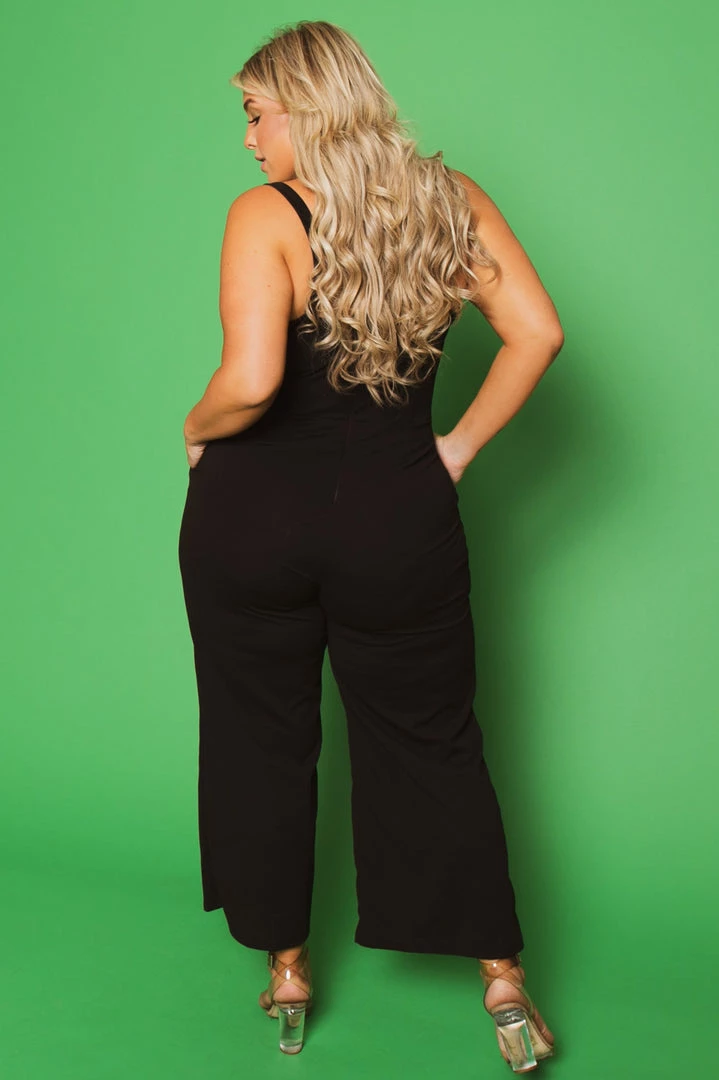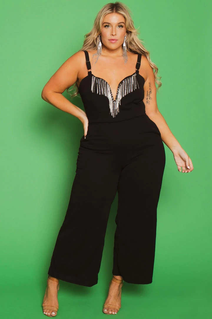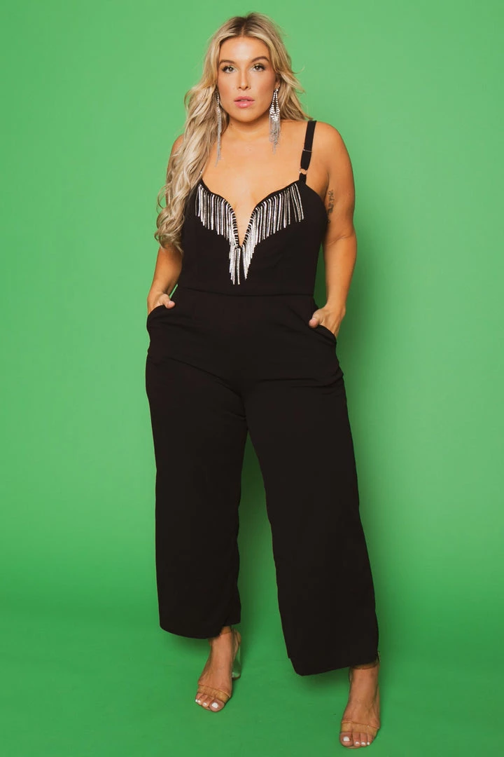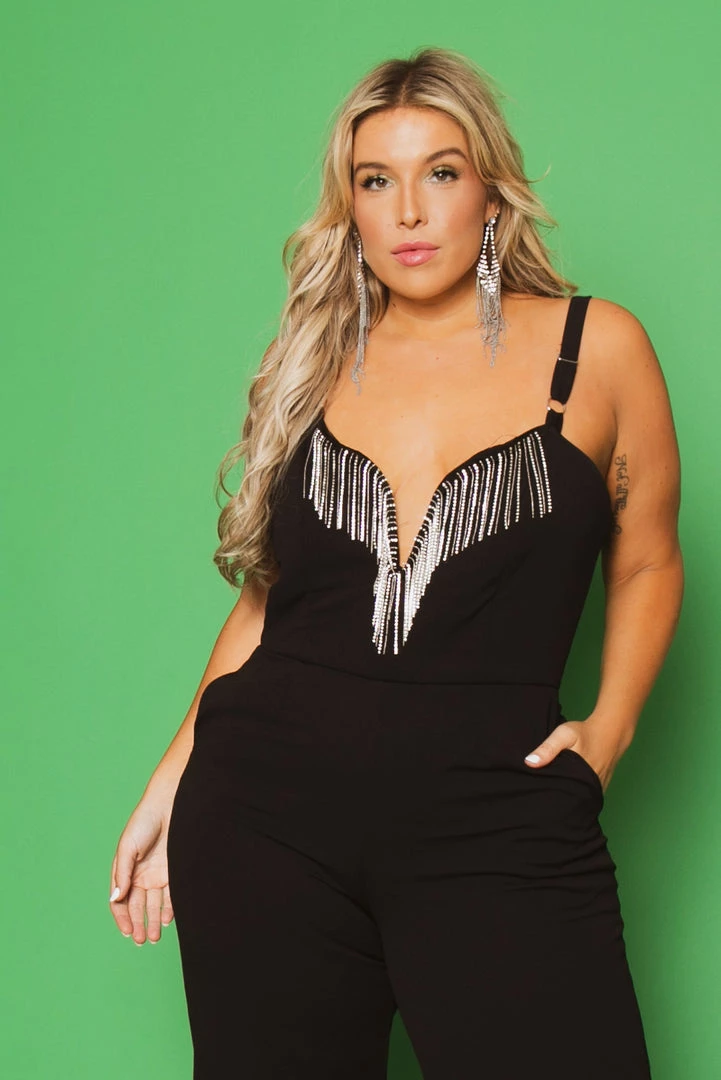 This plus size, jumpsuit features rhinestone details in a plunging v neckline, adjustable straps and wide flare pant leg