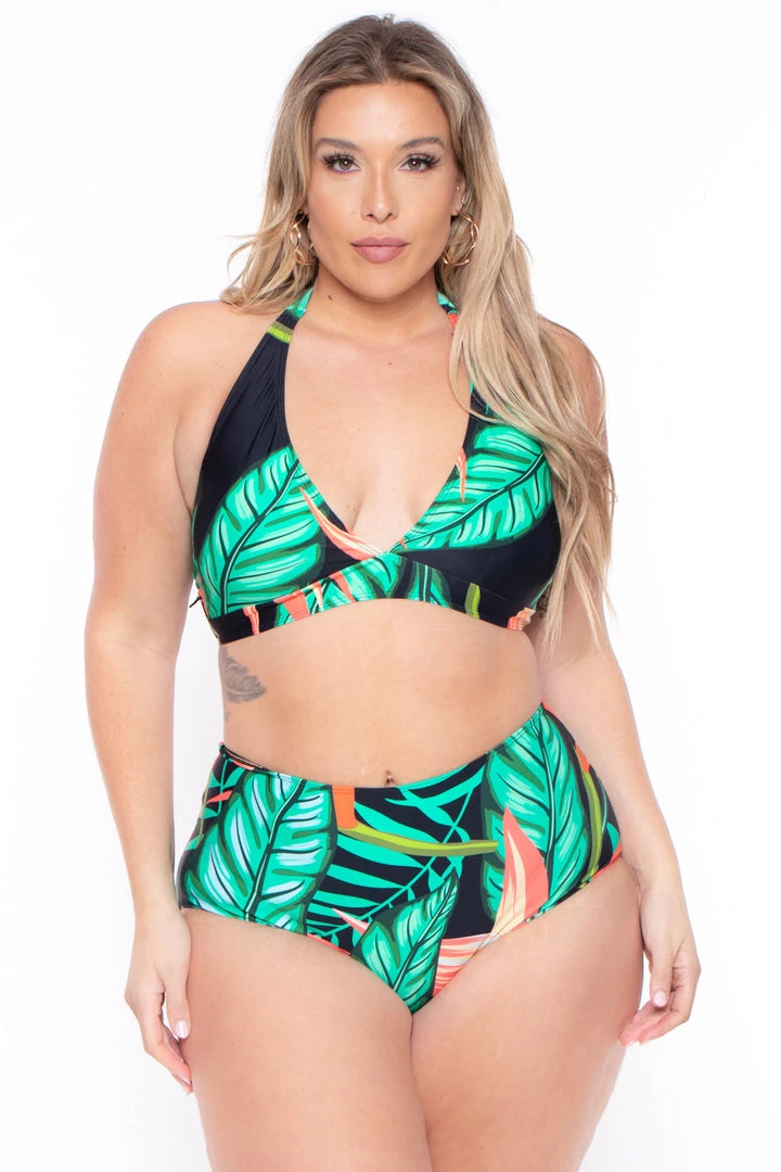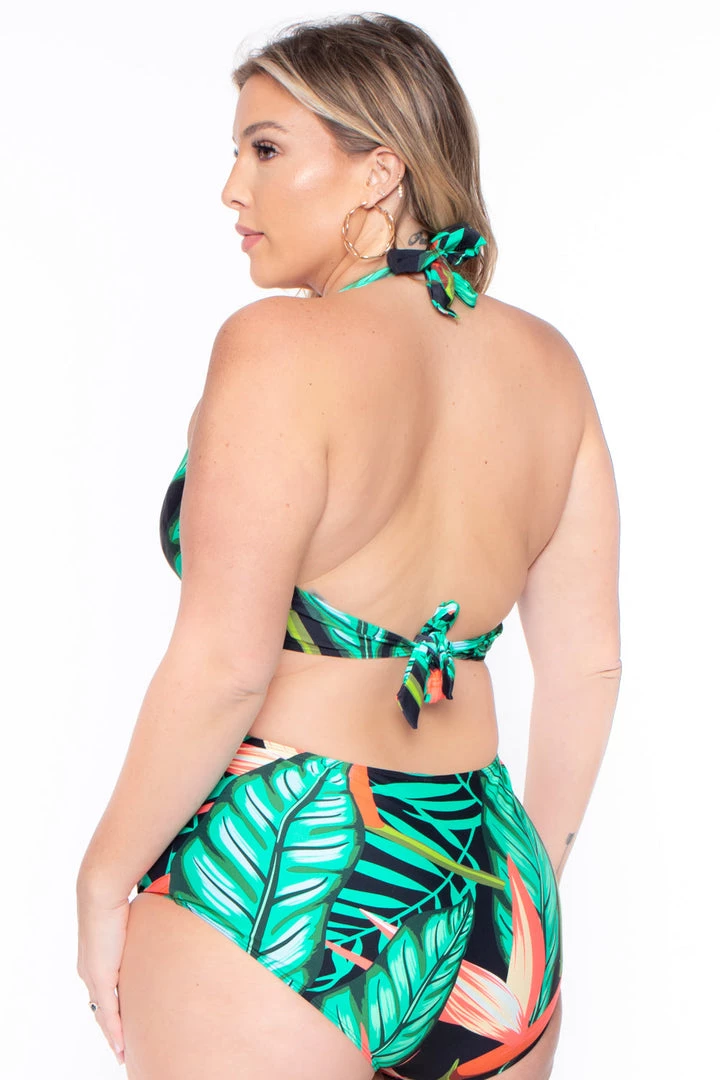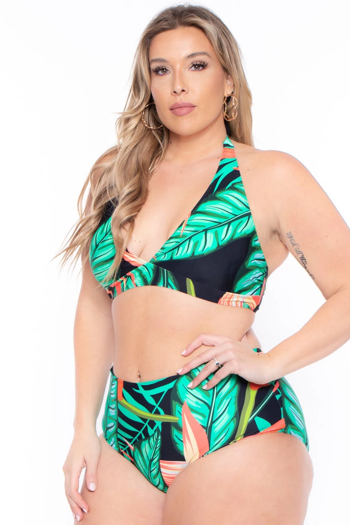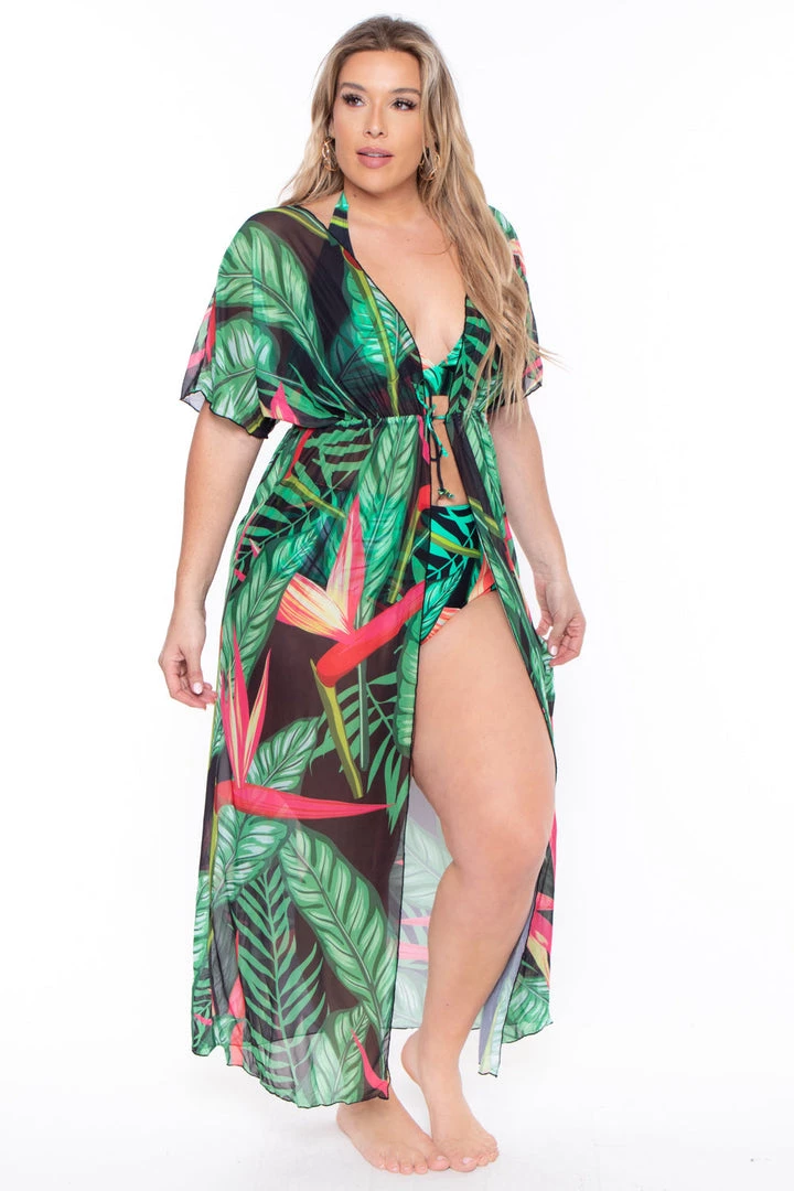 This plus size, bikini set features a vibrant tropical print all over with an open v neckline with tie halter, high waist cut bottoms with full coverage and matching mesh coverup with elastic waistband and adjustable tie