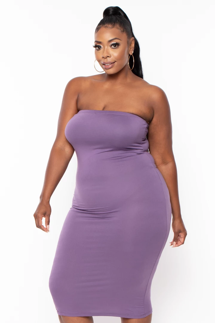 This plus size, stretch knit tube midi dress features an elastic straight neckline, midi length, and a bodycon silhouette