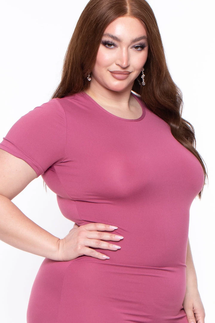 This plus size, basic dress features a curve hugging silhouette, side ruched detail with thigh slit, low scoop neckline, short sleeves and comfortable material
