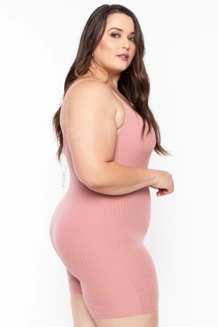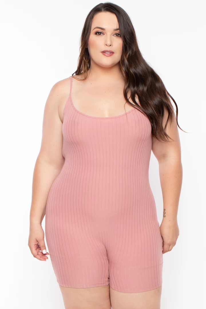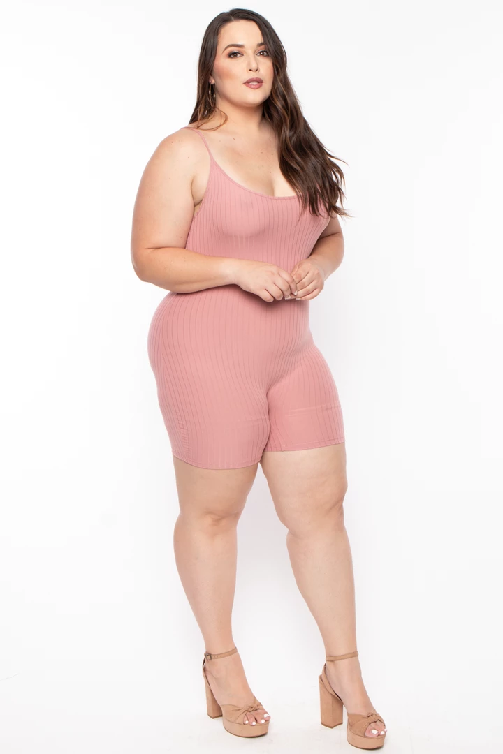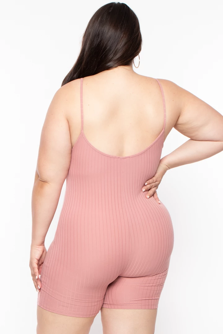 This plus size, stretch rib romper features a scoop neckline spaghetti straps, and all-over and a very soft and reach texture