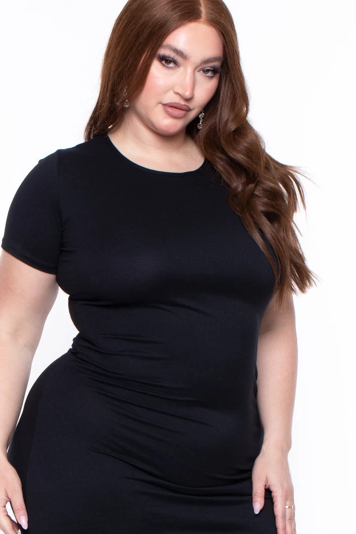 This plus size, basic dress features a curve hugging silhouette, side ruched detail with thigh slit, low scoop neckline, short sleeves and comfortable material