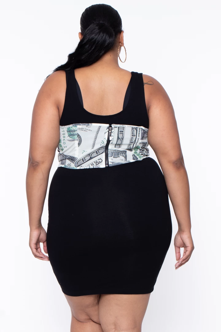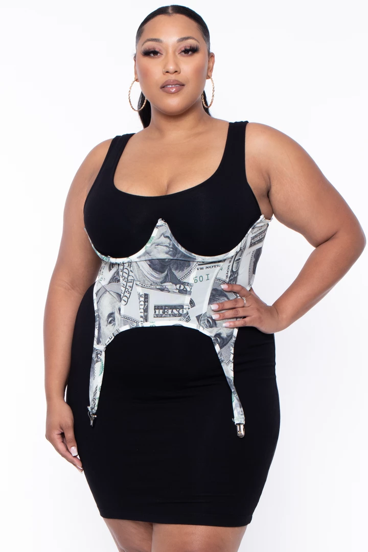 This plus size, stretch-mesh underbust bustier features a strapless bustline, underbust wire for better shape and structure partial front and back boning for great bodice shape front suspender buckle, back exposed zipper and fun all over dollar bill print.
