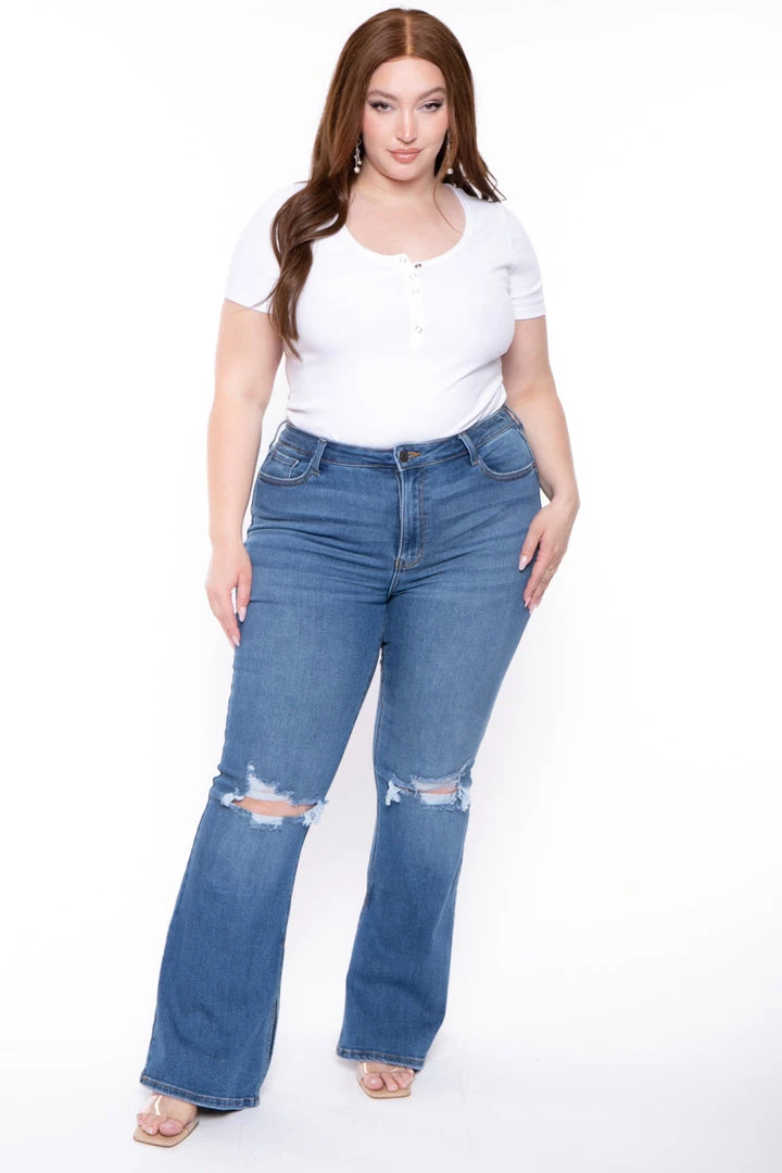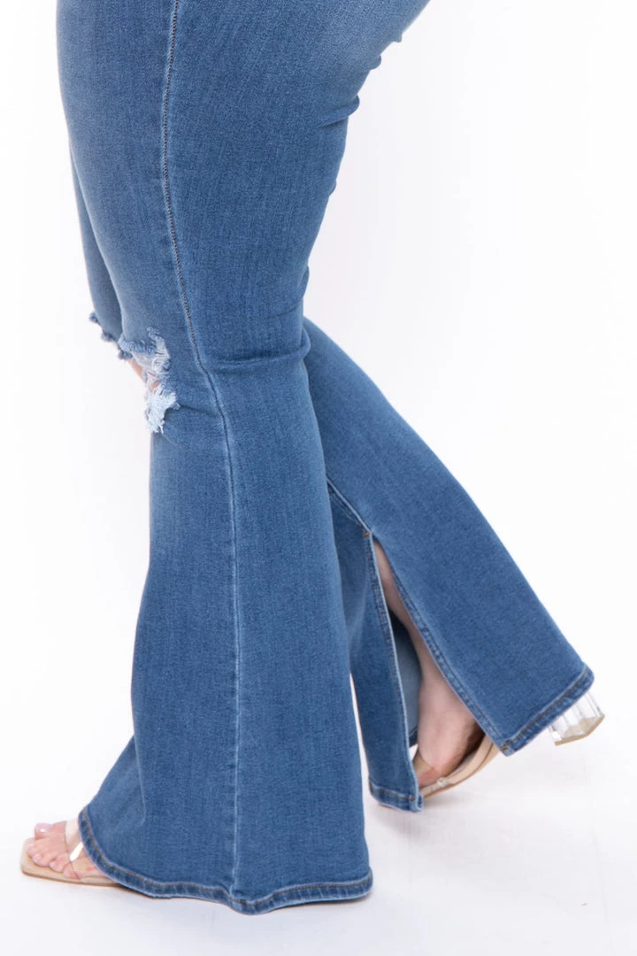 This plus size, jeans features a wide flare leg with side slit details. Light distressed details and nice stretch!