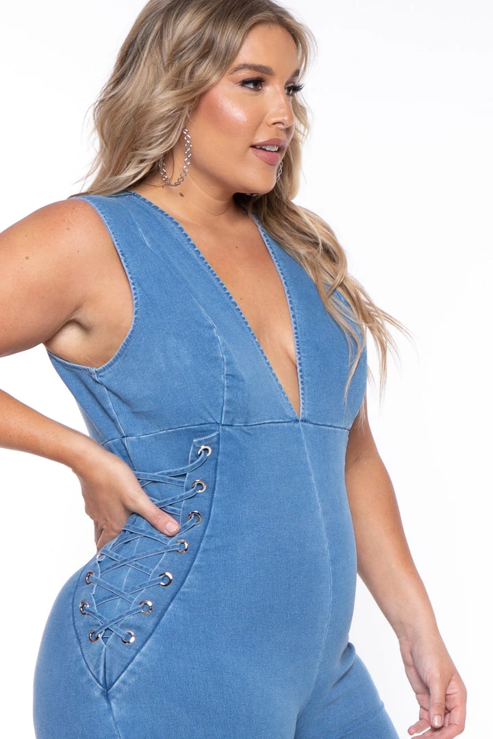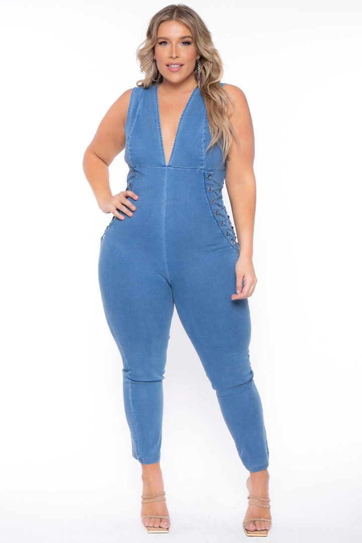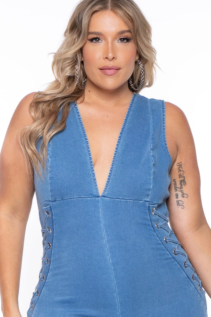 This plus size, denim jumpsuit features a curve hugging silhouette and side criss cross details for an extra snatched look, deep v neckline, sleeveless and center back zipper closure