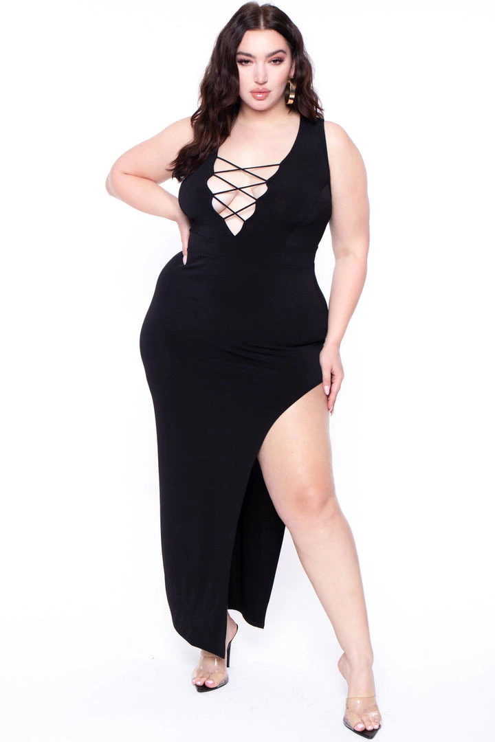 This plus size, stretch knit bodycon dress features a deep plunging v-neckline with a criss cross caged detail, sleeveless cut, a sexy high side slit, and a form fitting silhouette
