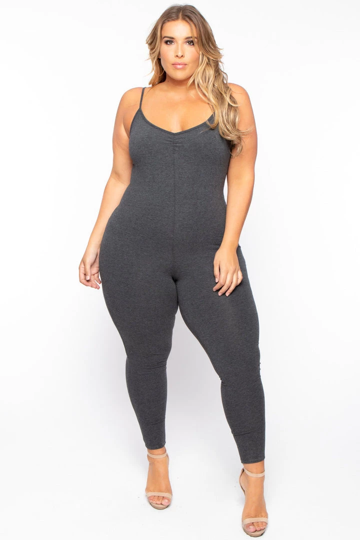 This plus size, stretch knit jumpsuit features a sleeveless design, a v-neckline with adjustable straps for and added comfort, contrast binding, a smocked design detail at bust, a tapered skinny leg with an elasticized rib knit binding at bottom hem.