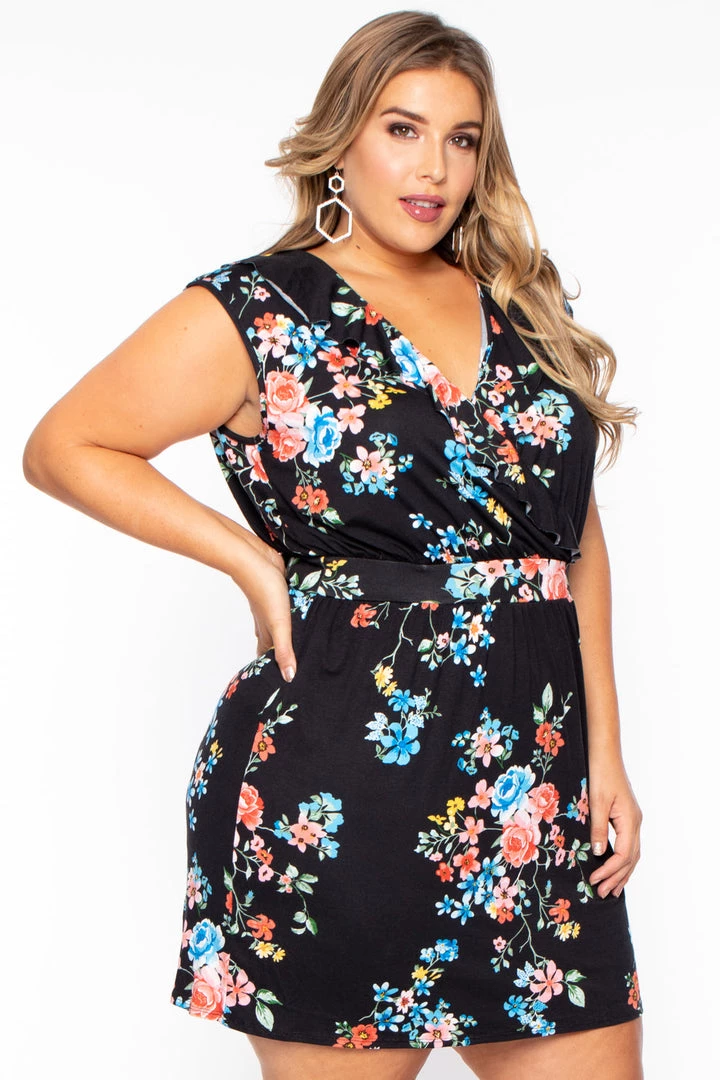 This plus size, stretch knit dress features a v-neckline with a cross front style, a ruffle detailing, a sleeveless cut, a self-tie back spaghetti strap at back neck, light pleating, an elasticized waist, and a flared bottom hem.