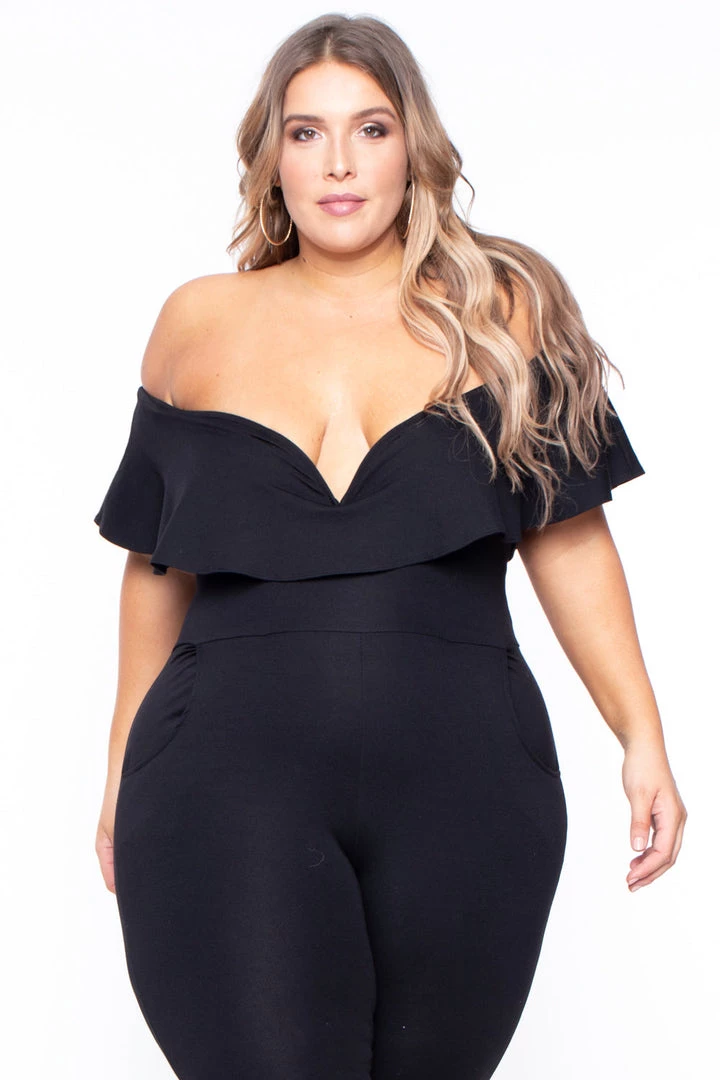 This plus size, stretch knit jumpsuit features an off the shoulder neckline, a frill ruffle detailing with an added underwire for an added support, a sleeveless cut, front side pockets, and a tapered leg.