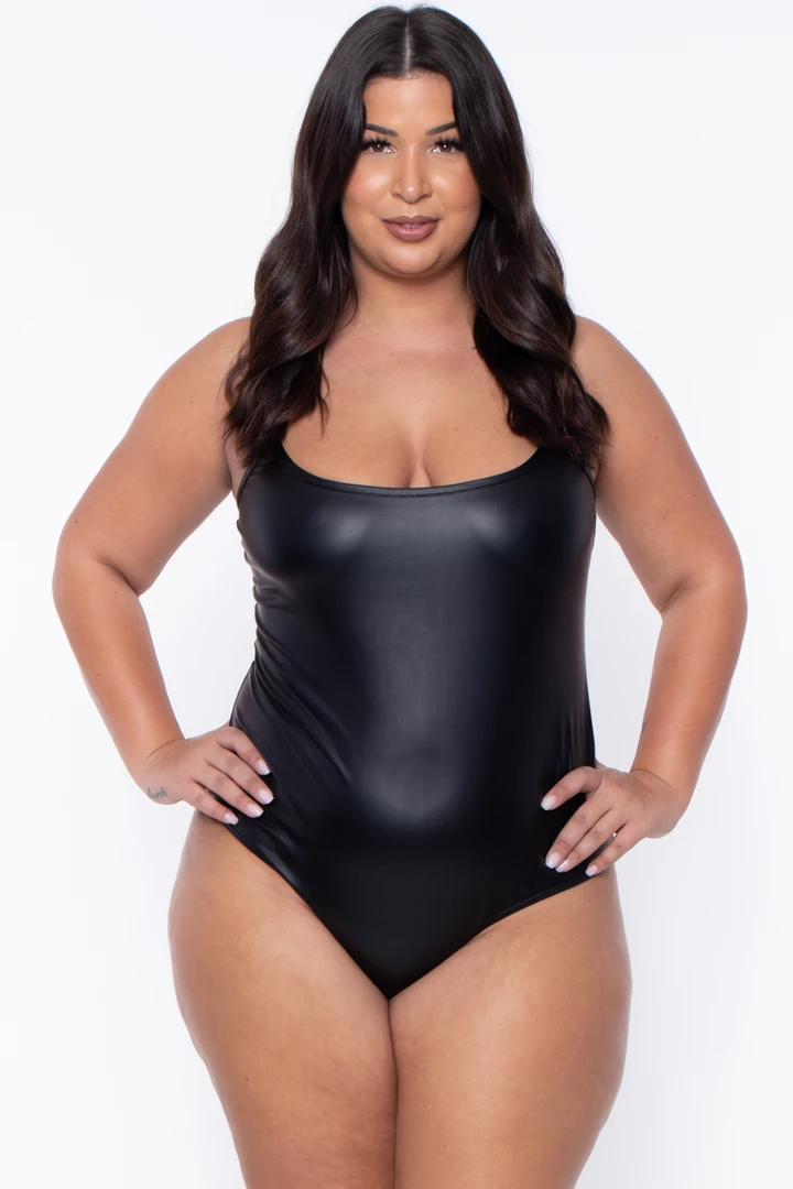 This plus size, faux leather bodysuit a scoop neck, adjustable cami straps, cheeky cut bottom, and dual snap-button bottom closures it’s just the perfect faux leather bodysuit to match with our faux leather shorts