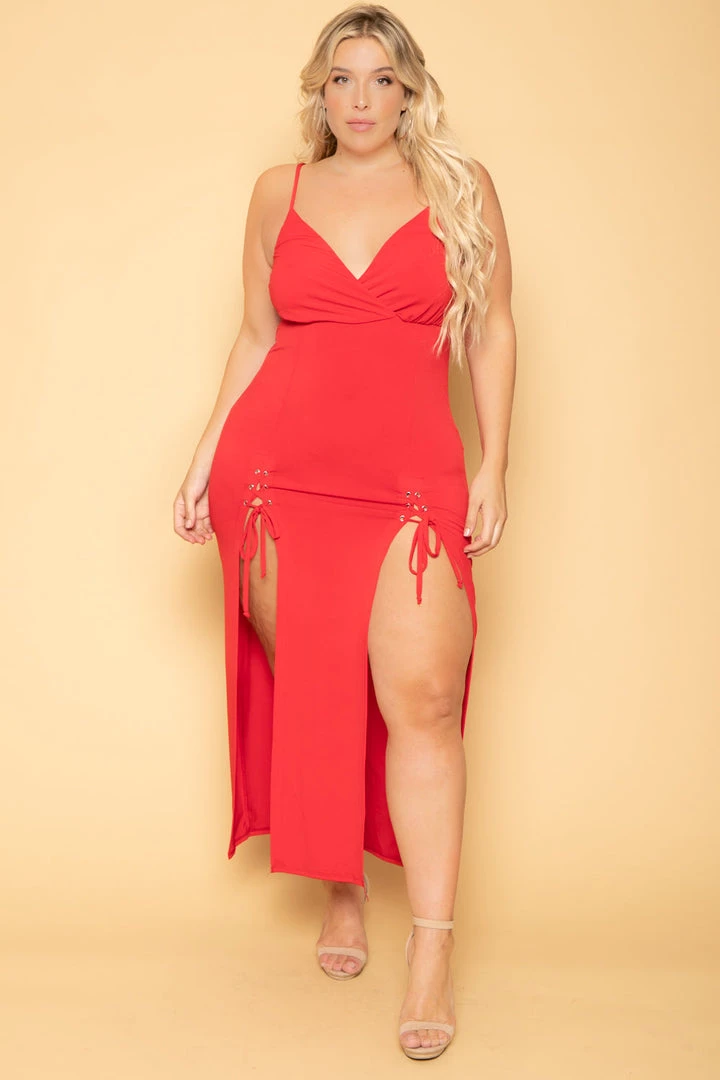 This plus size, super soft stretch knit maxi dress features a v-neckline with a cross front style and adjustable straps for an added comfort, light shirring, pleating and drape, a sleeveless cut, , and a m-slit with a lace up grommet detail at bottom hem.